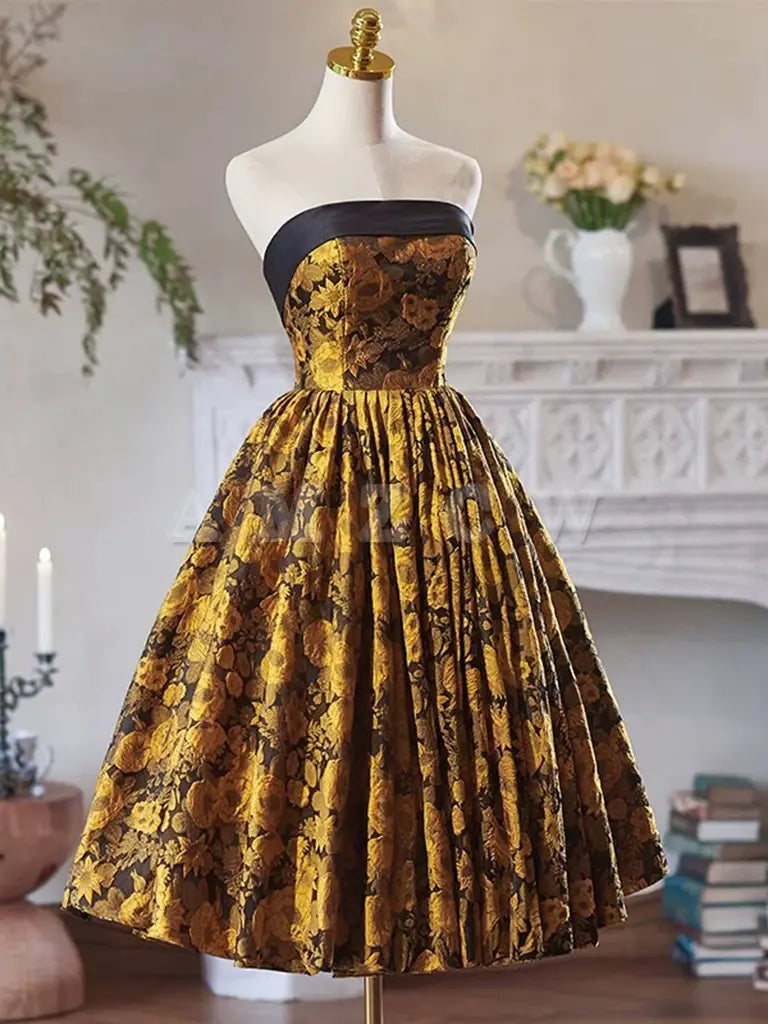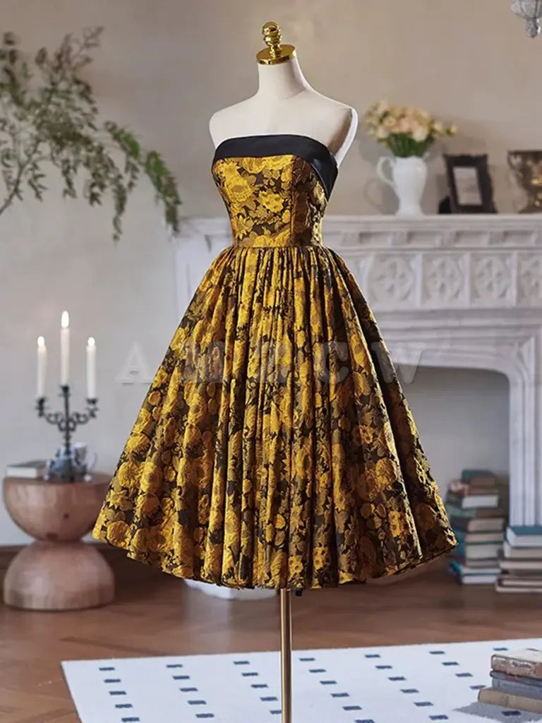 Vestido de fiesta corto amarillo de satén con corte en A sencillo de Amzcw. Vestido de fiesta amarillo para el regreso a casa. Vestido de fiesta en tienda.