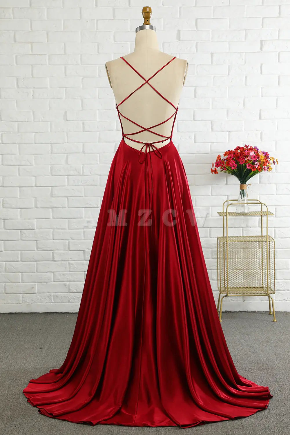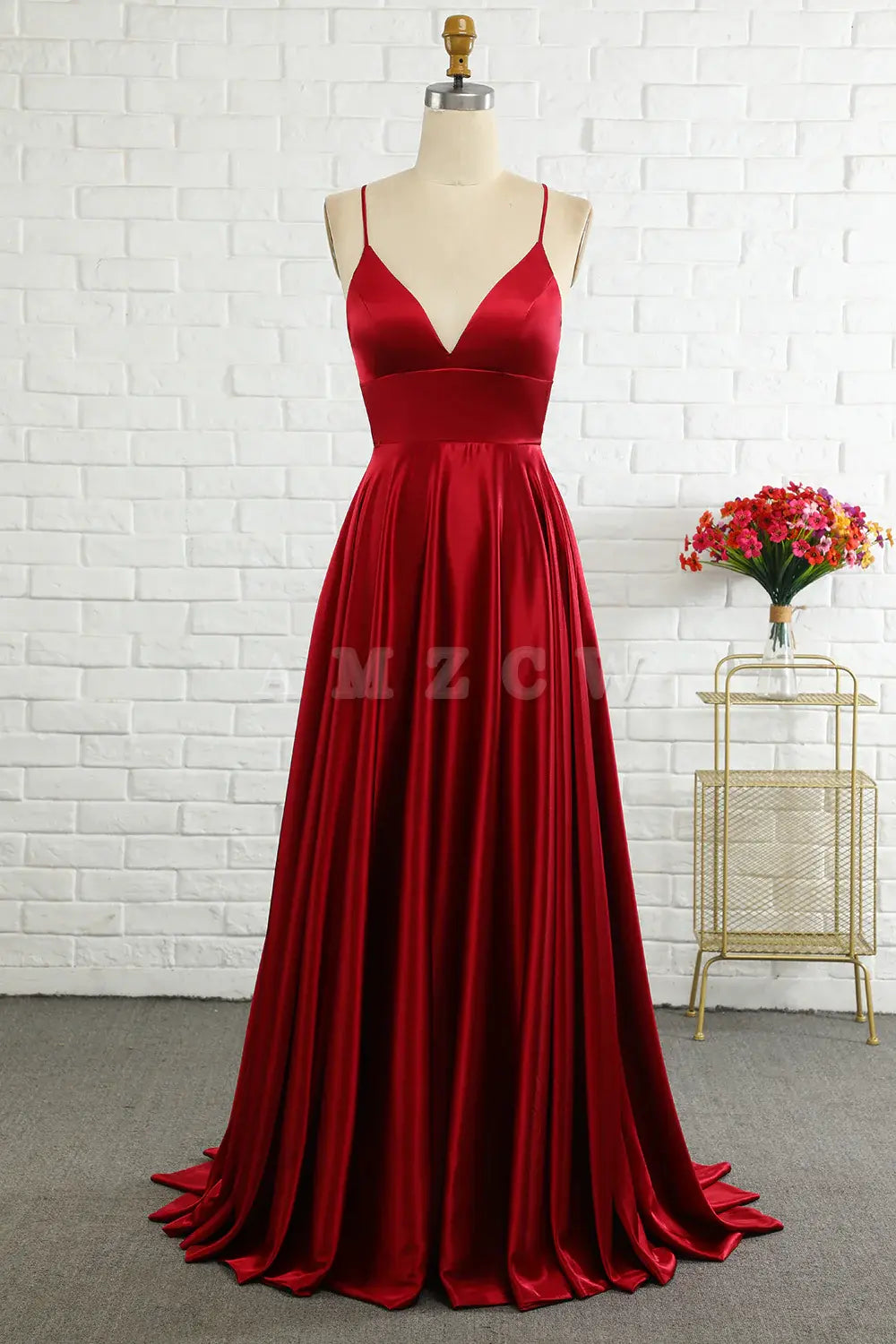 Vestido de fiesta largo burdeos con tirantes finos, corte A, sencillo y espalda cruzada, de Amzcw