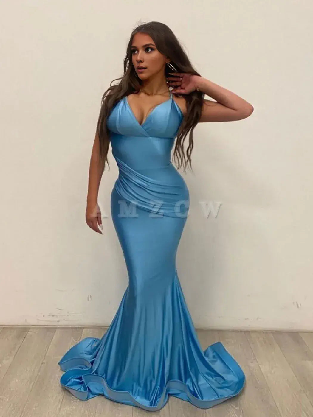 Amzcw Vestido de fiesta largo de sirena de satén azul sencillo, vestido de noche azul, vestidos formales