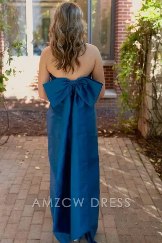 Vestido de fiesta formal de satén con escote redondo, plisado y corte A, sin tirantes y con lazo grande de Amzcw