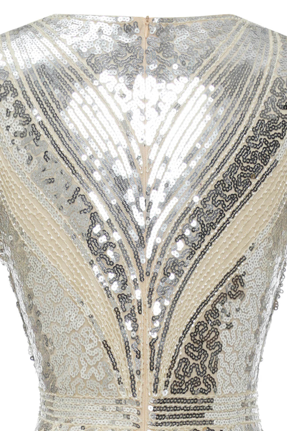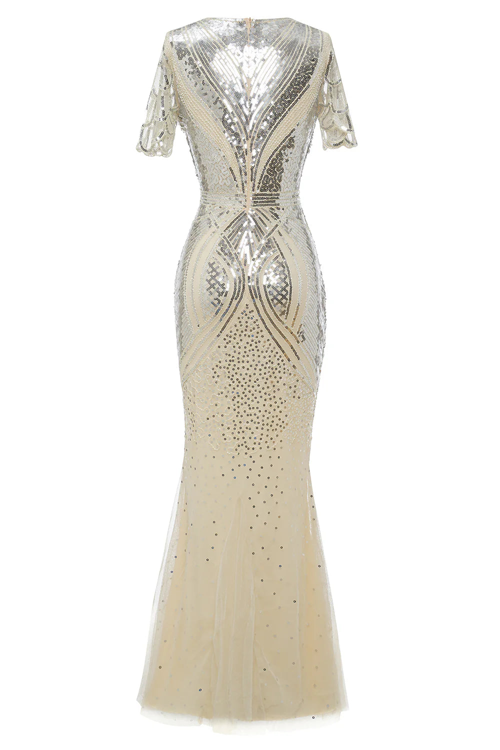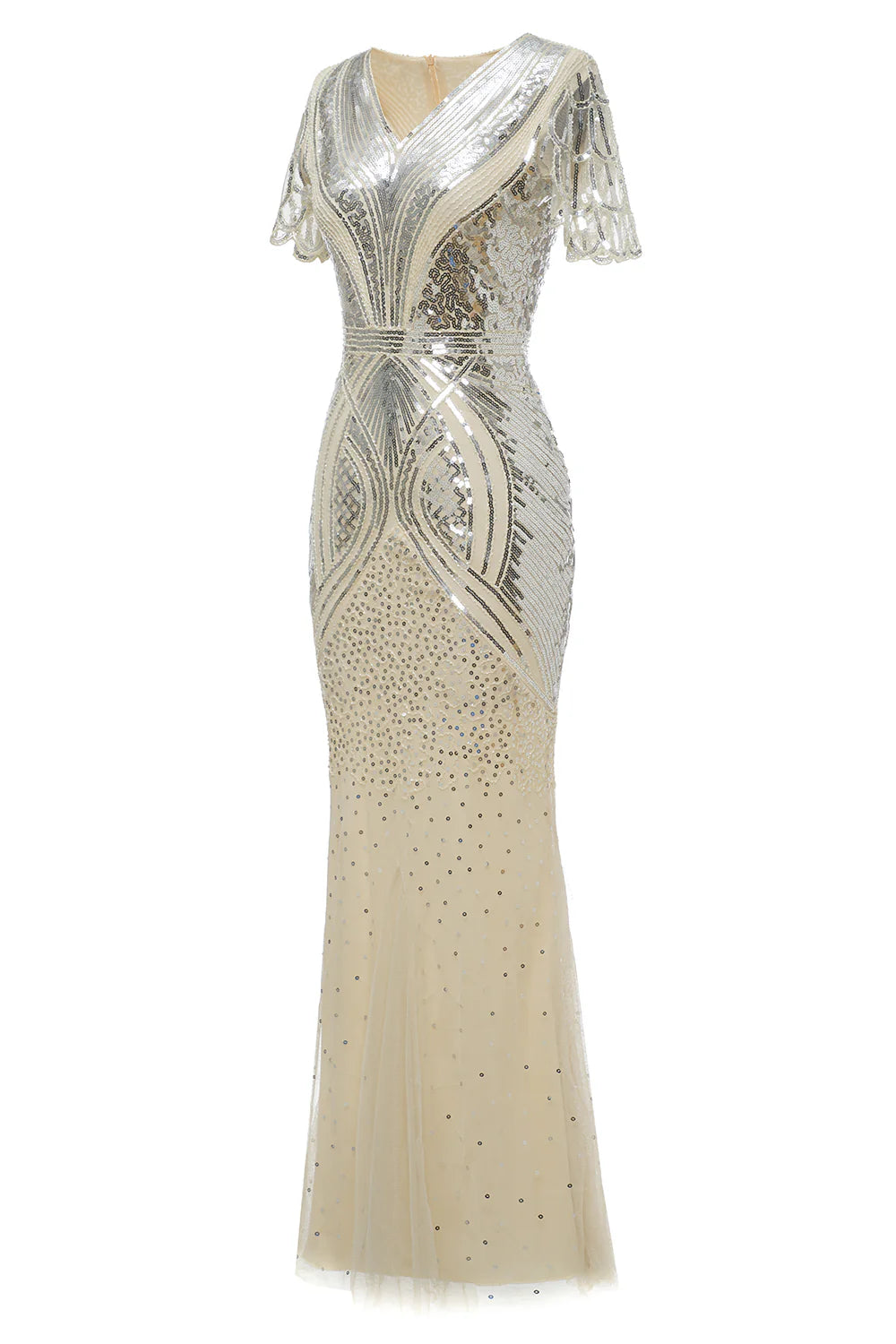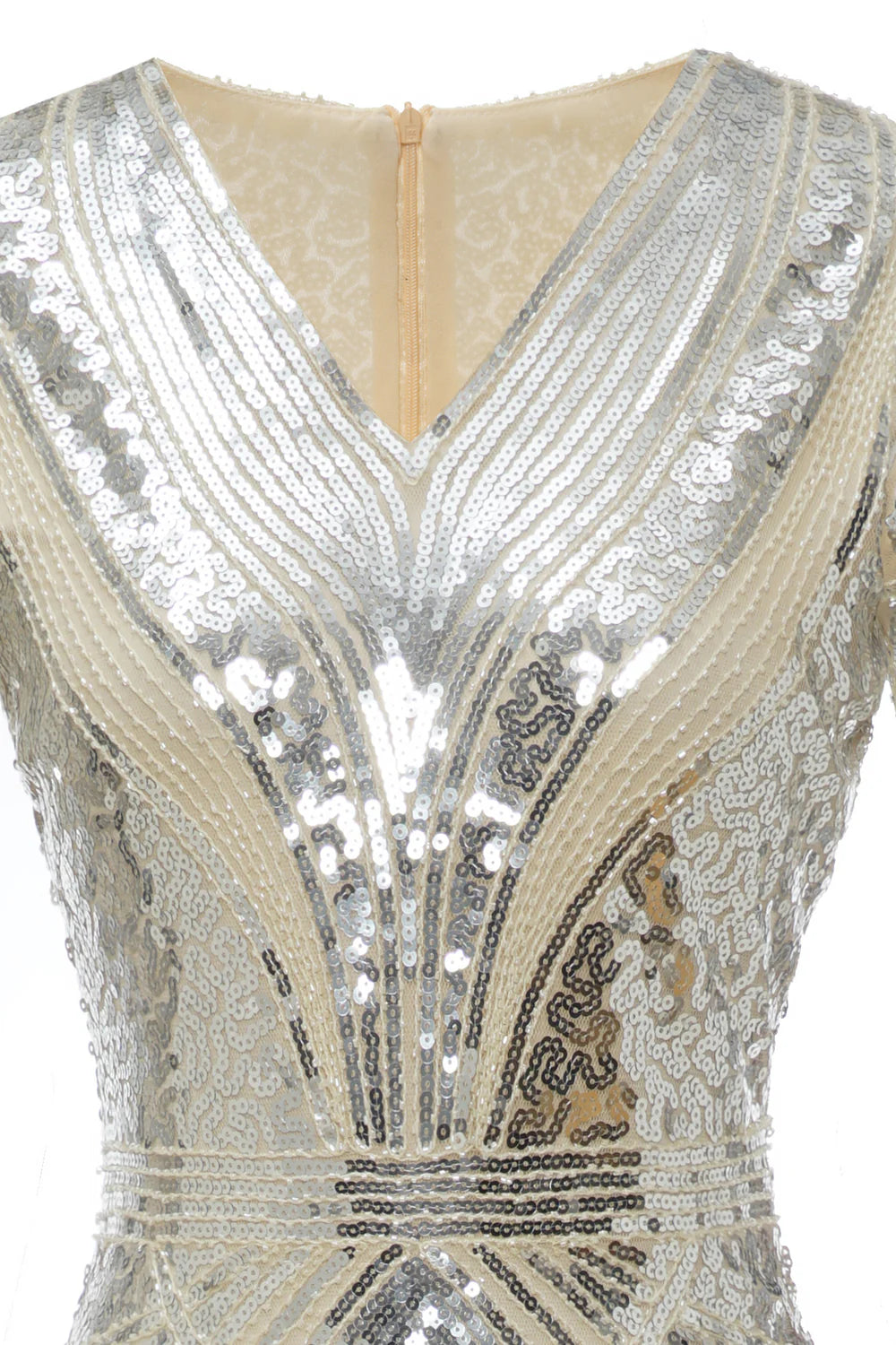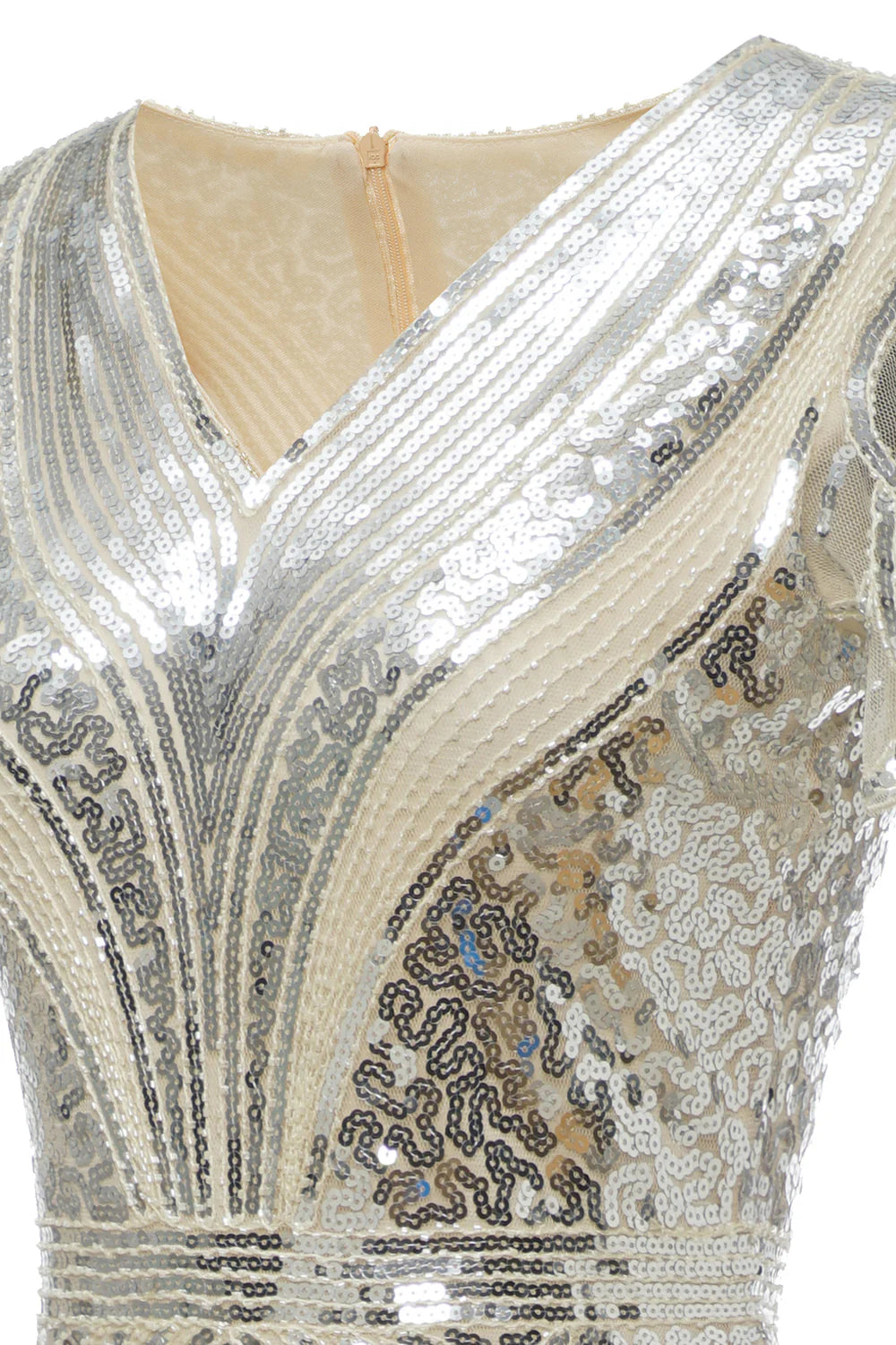 Vestido de fiesta de los años 20 con lentejuelas color albaricoque