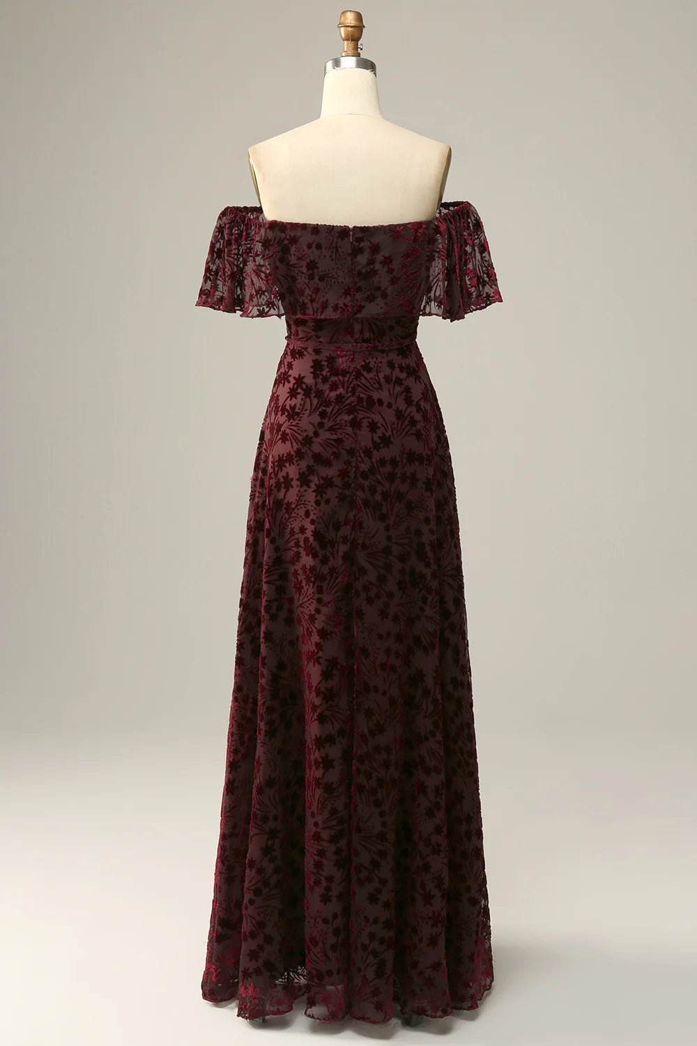Vestido de noche con hombros descubiertos y flores color burdeos