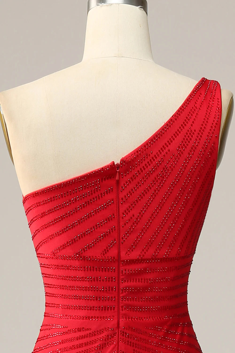 Vestido de fiesta largo rojo de sirena con un solo hombro y cuentas