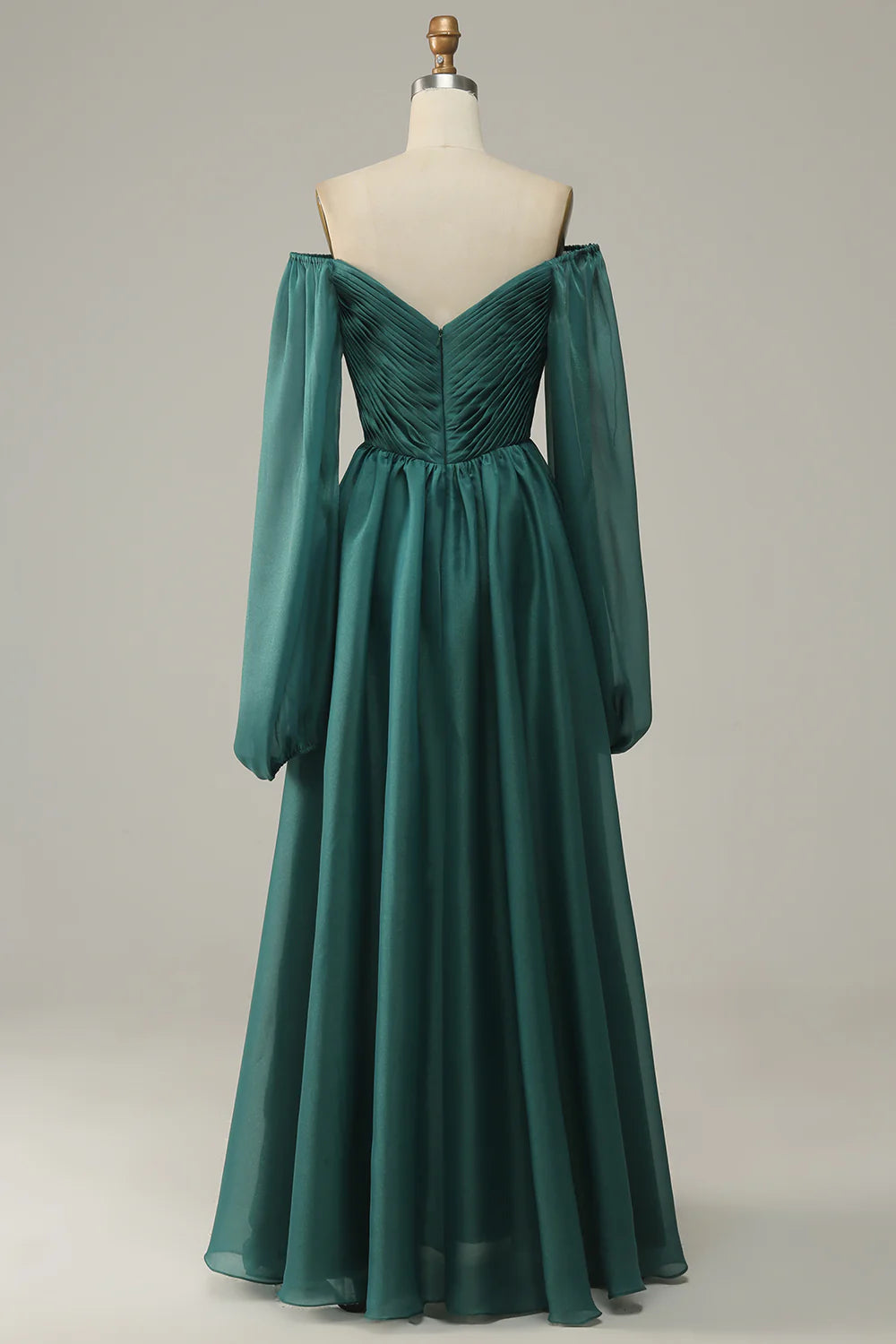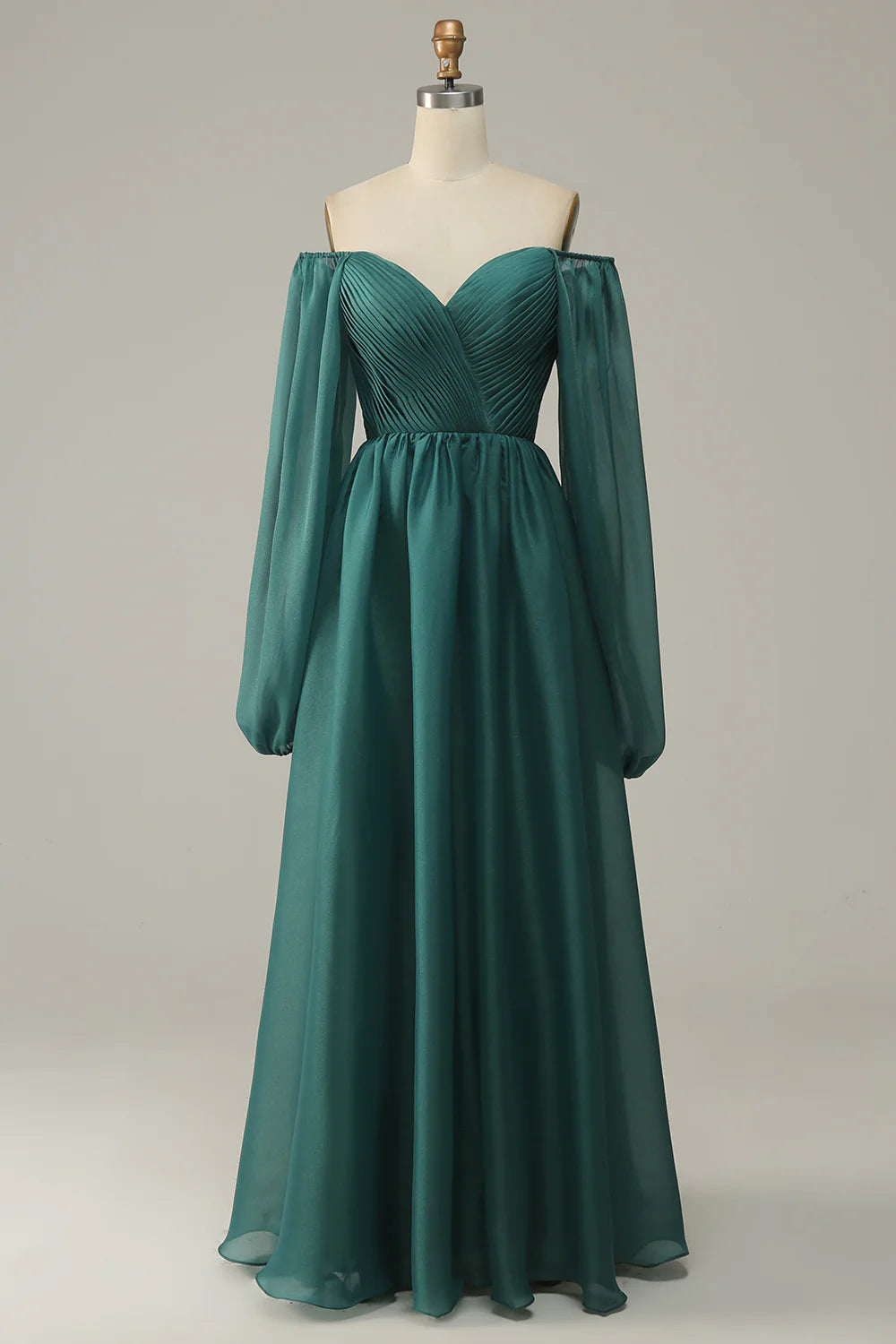 Vestido de fiesta de manga larga con hombros descubiertos y volantes