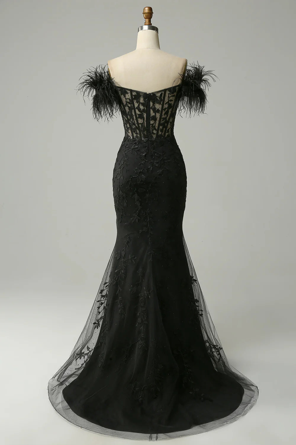 Vestido de fiesta de sirena negro con hombros descubiertos y plumas
