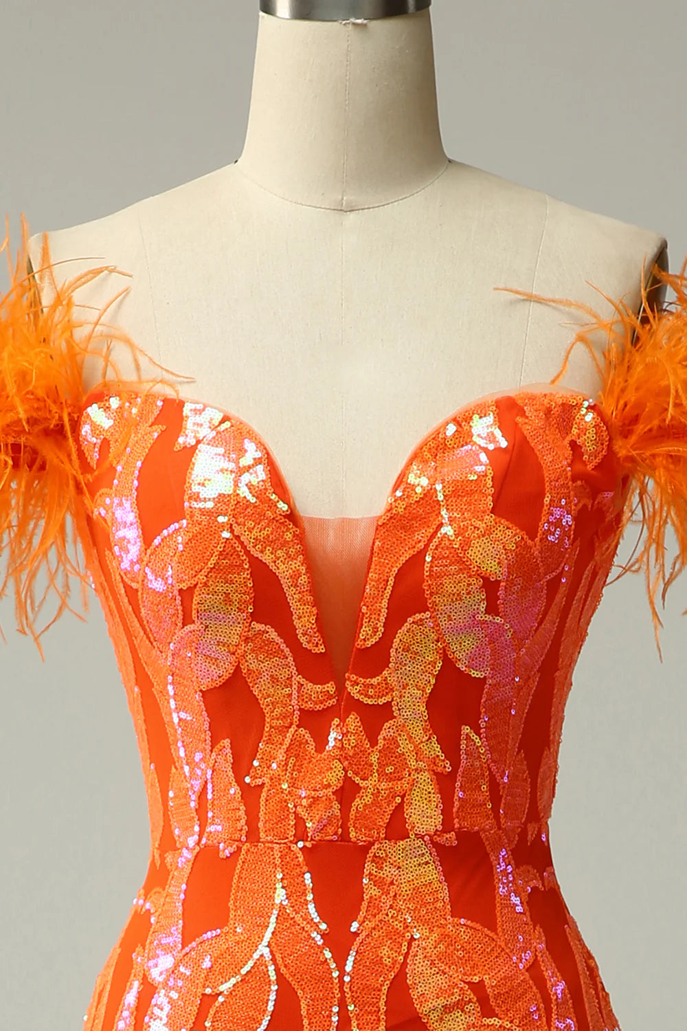 Vestido de fiesta de sirena con hombros descubiertos, lentejuelas naranjas y plumas