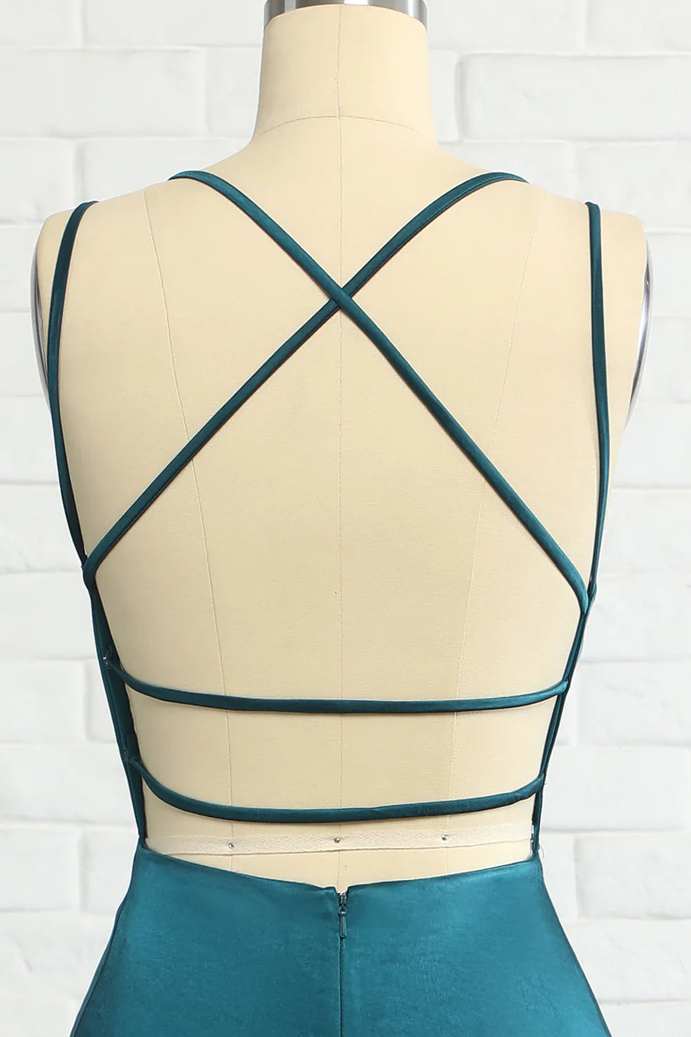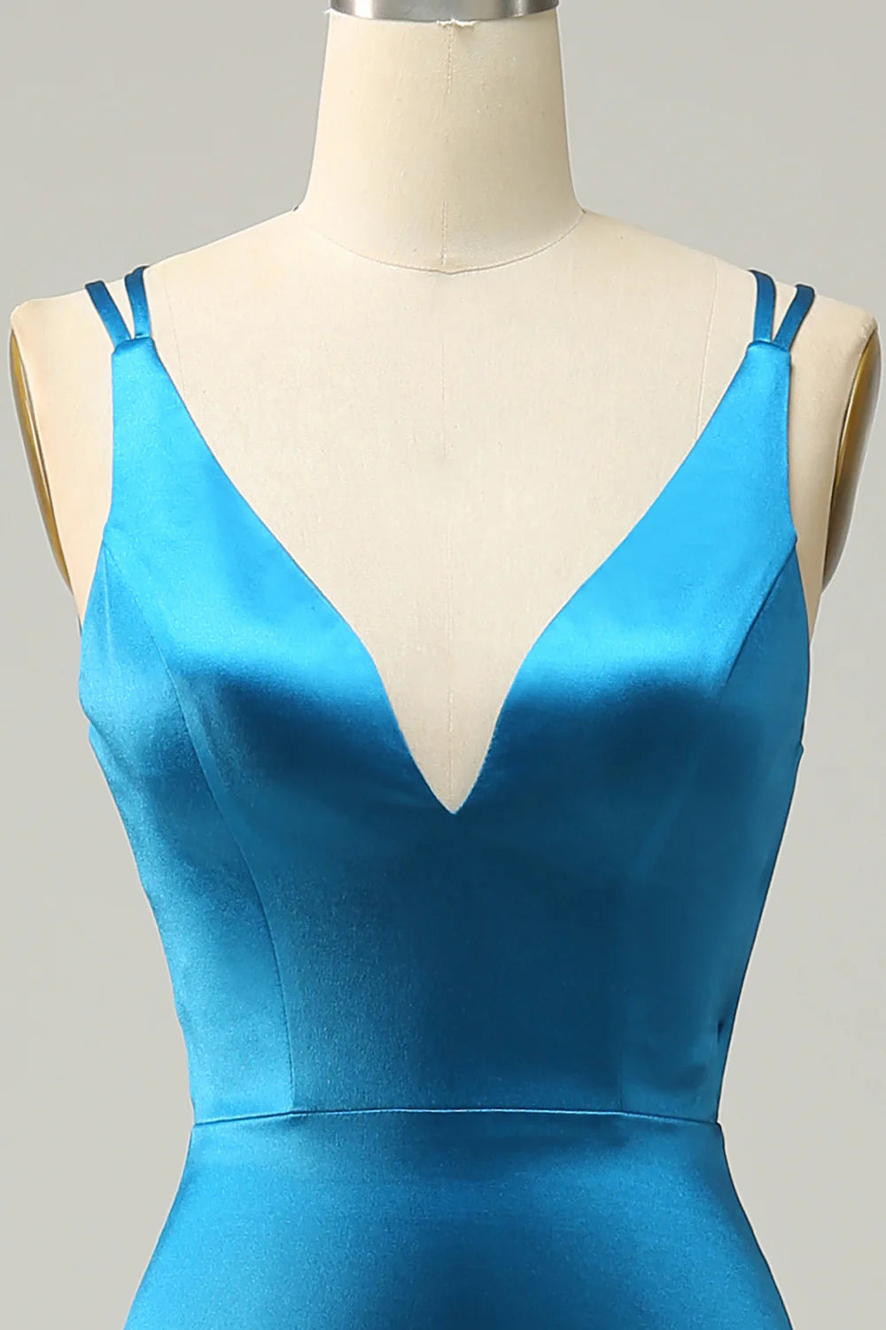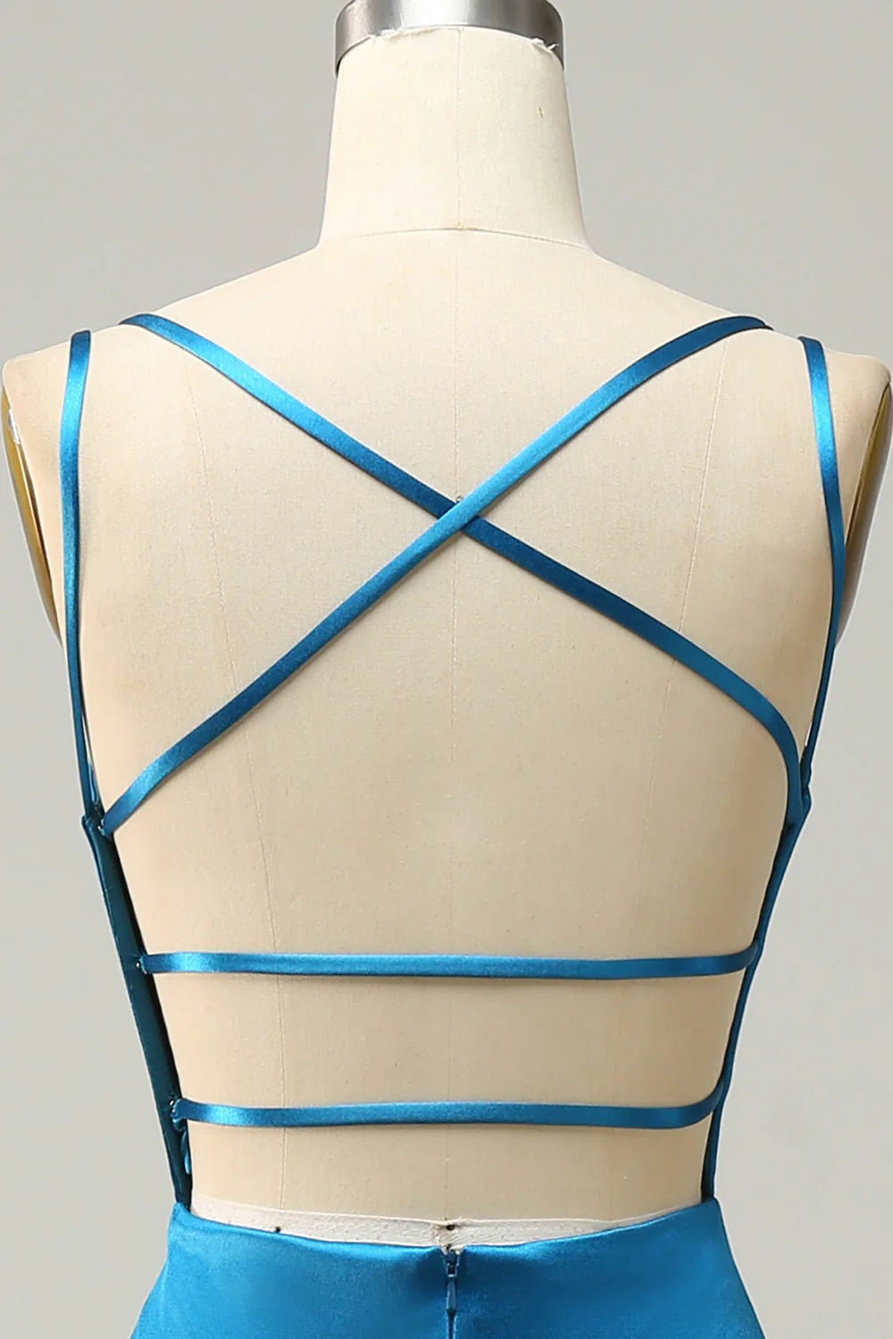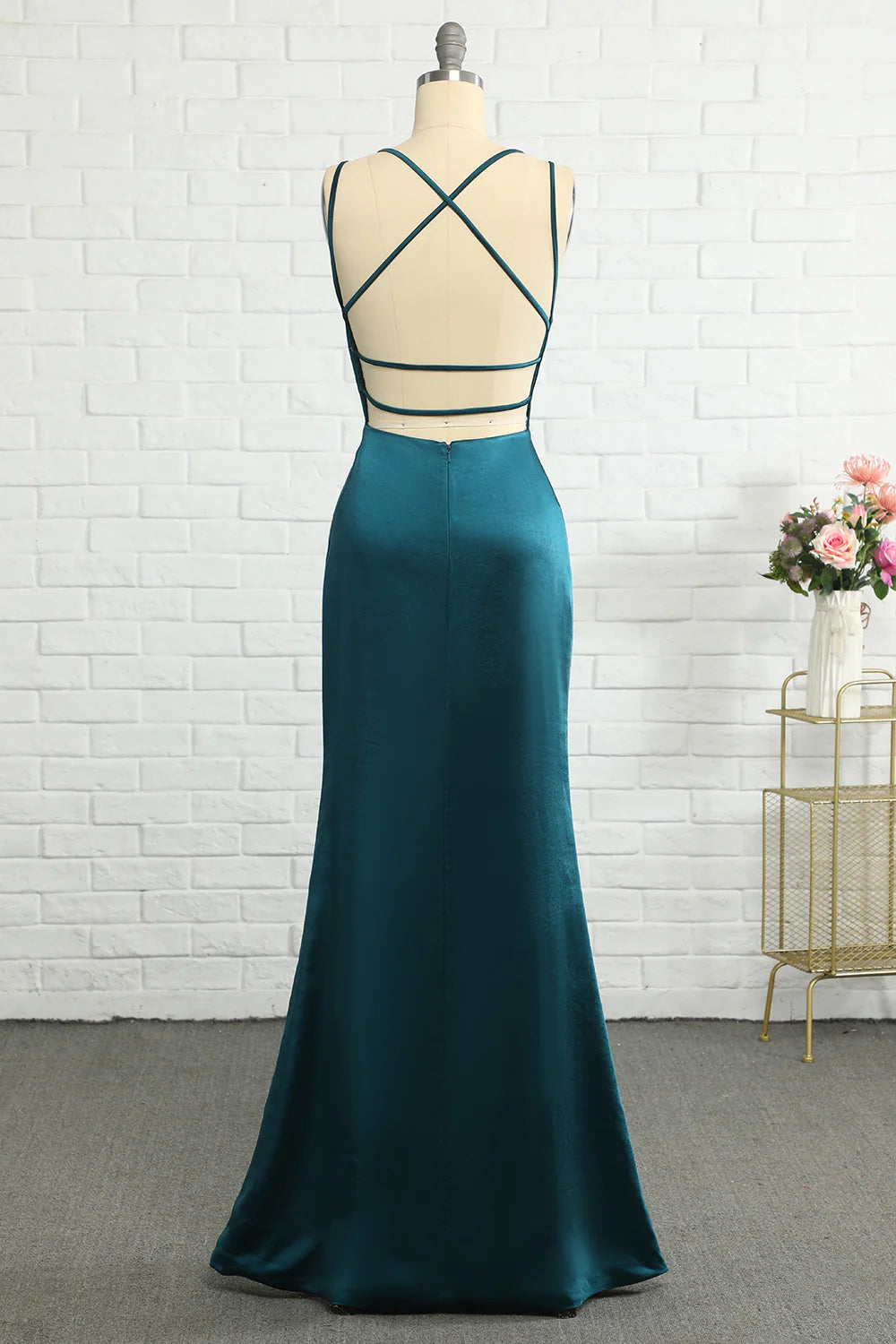 Vestido de fiesta largo sin espalda de sirena en azul pavo real