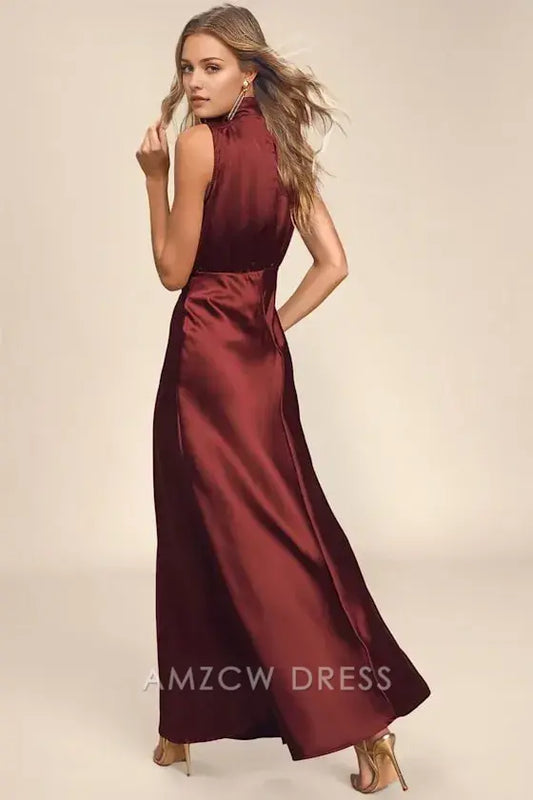Amzcw Elegancka Klasyczna Elegancja Różowa Satynowa Sukienka Maxi Bez Rękawów z Golfem Sukienki Na Formalne Ubrania