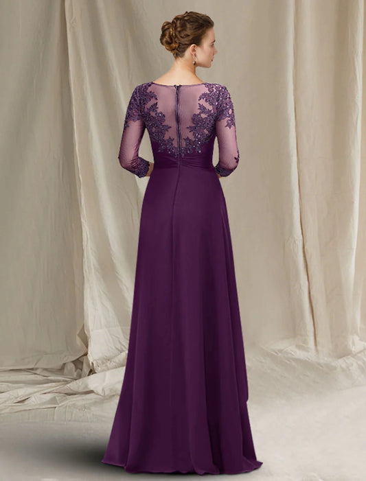 Suknia dla matki panny młodej w kształcie litery A, luksusowa, elegancka, z dekoltem w kształcie łezki, sięgająca do ziemi, z szyfonu, koronki, z cekinami, z rękawami o długości 3/4, z plisami i aplikacjami z koralików