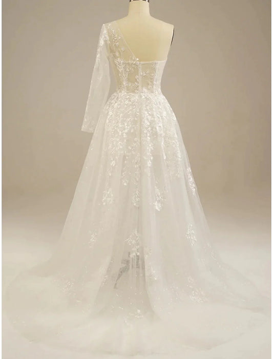 Seksowne suknie ślubne w stylu boho, plażowe, z dekoltem w kształcie litery A, na jedno ramię, z długim rękawem, z trenem typu sweep, koronkowe suknie ślubne z rozcięciem