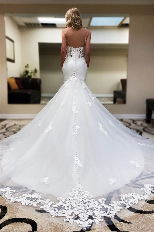 Eleganckie suknie ślubne typu syrena bez rękawów, na cienkich ramiączkach, z dekoltem w serek i koronkową aplikacją