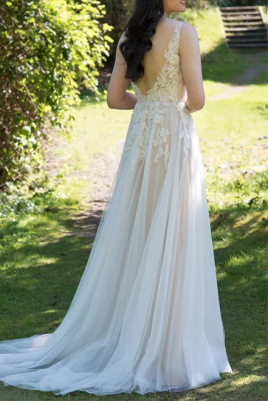 Piękne koronkowe aplikacje, bez rękawów, długie szyfonowe suknie ślubne na plażę