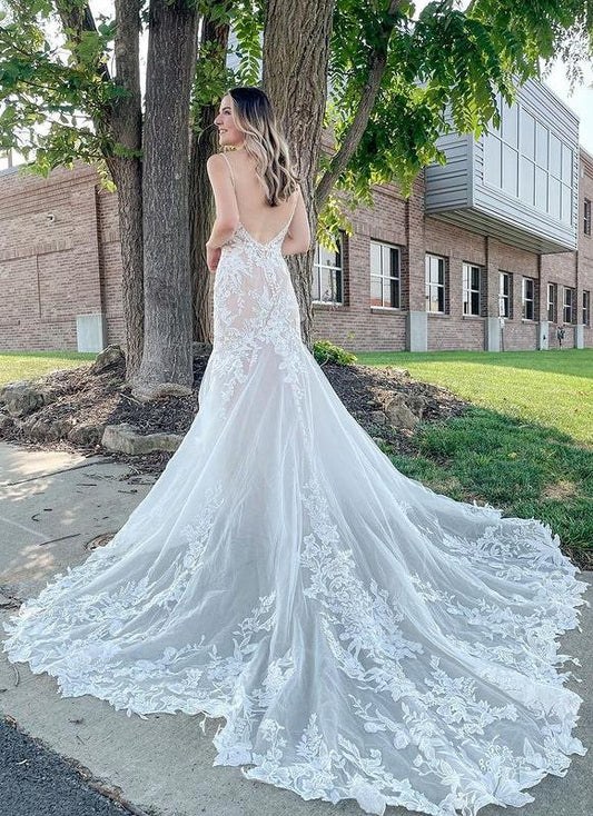 Suknie ślubne z koronką na ramiączkach typu spaghetti, z odkrytymi plecami i aplikacją z trenem