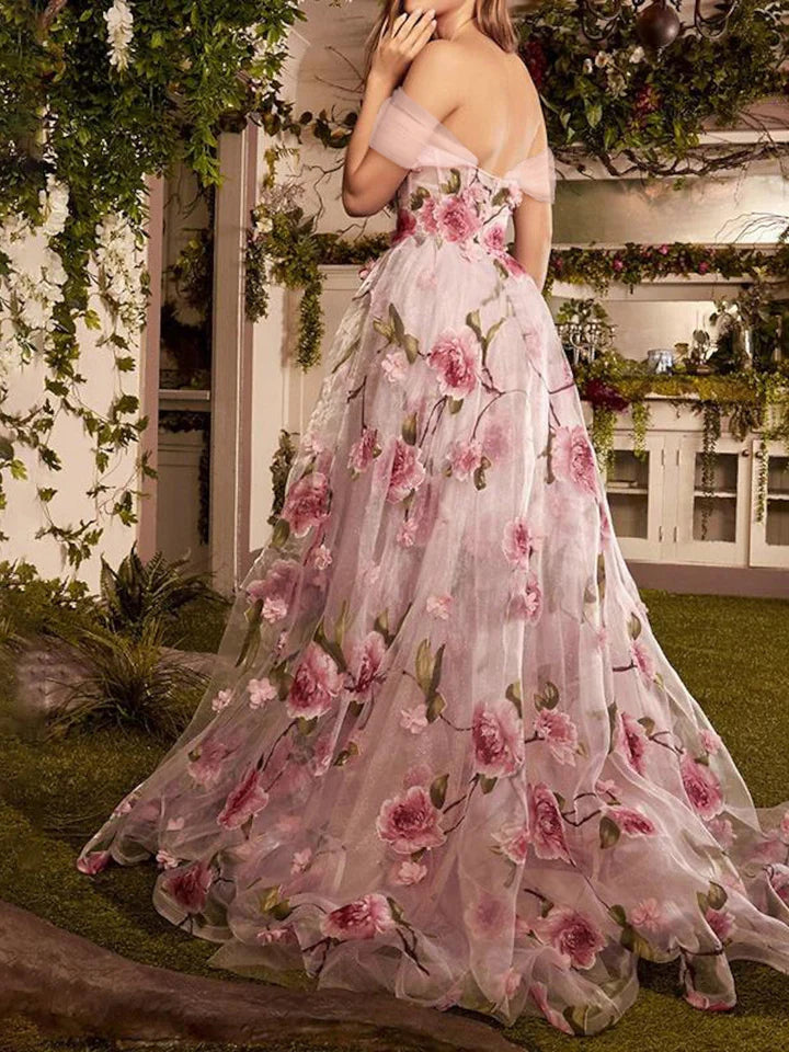 Suknie balowe w kształcie litery A/księżniczki z odkrytymi ramionami i kwiatowym wzorem i rozcięciem z boku