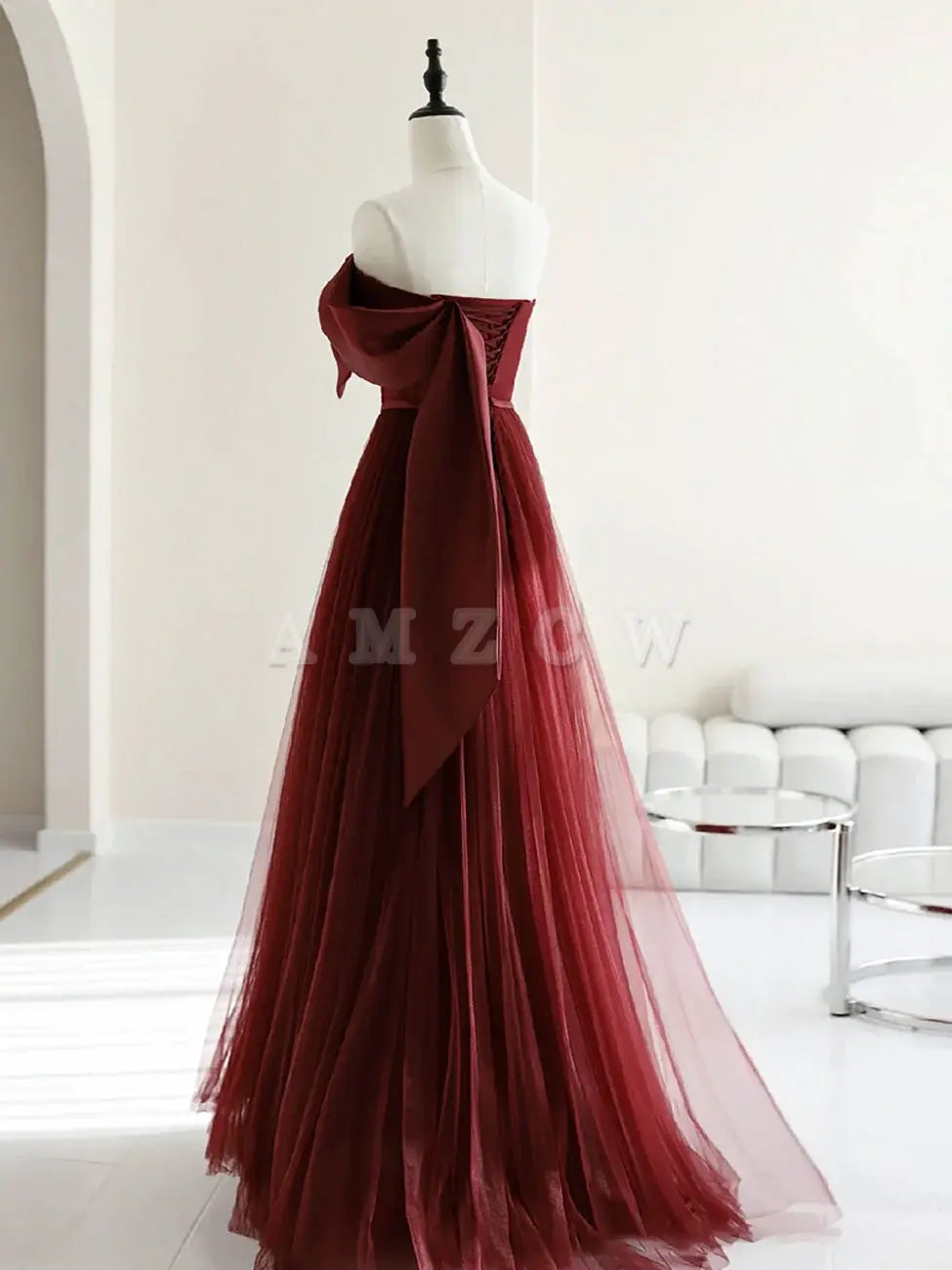 Suknie wieczorowe Amzcw w kształcie litery A z tiulu w kolorze bordowym, długie, bordowe, formalne, wieczorowe, suknia balowa w sklepie