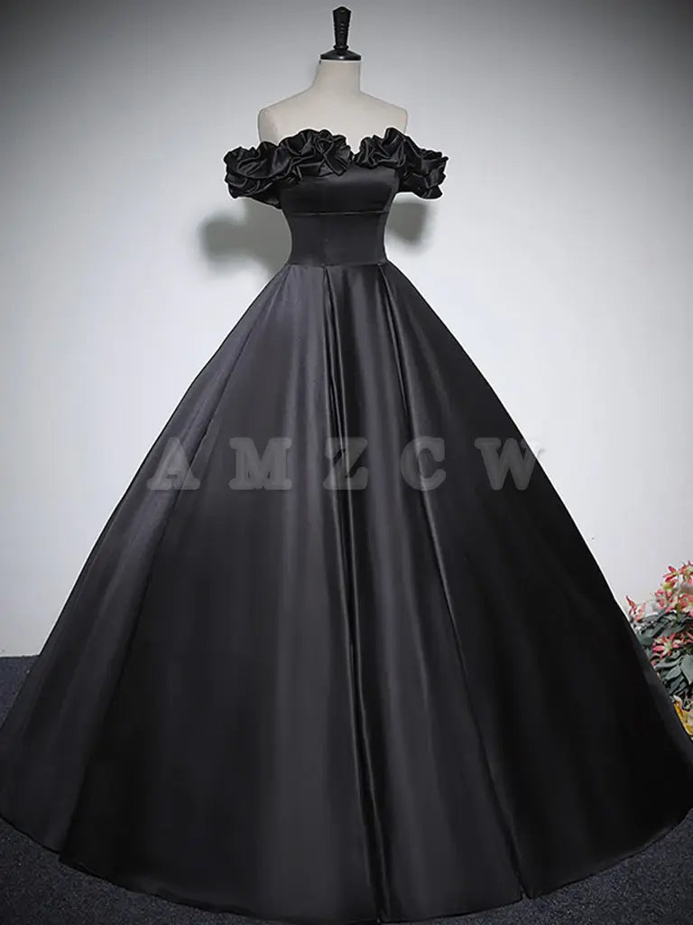 Amzcw Czarna satynowa sukienka wieczorowa z odkrytymi ramionami i długim rękawem, czarna, formalna sukienka, sukienka na studniówkę w sklepie