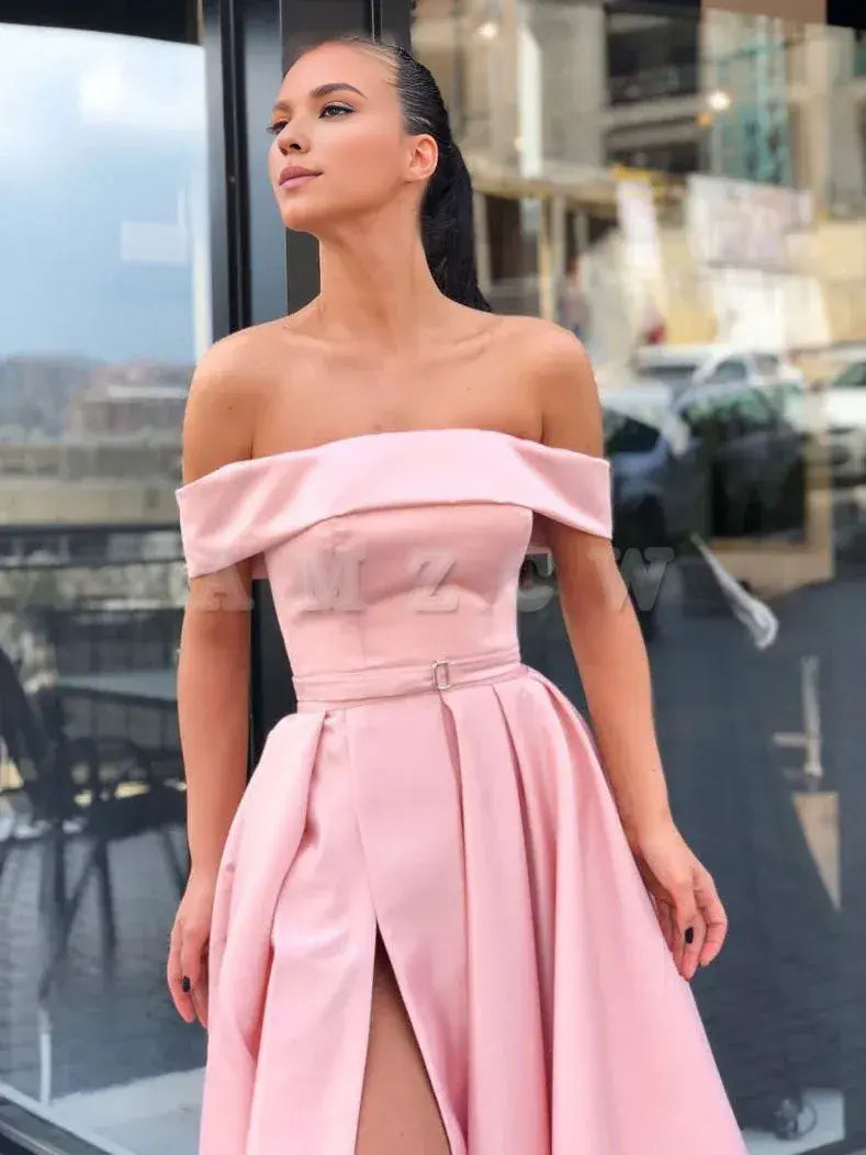 Amzcw Prosta sukienka wieczorowa z satyny w kolorze różowym, długa, z linii A, na studniówkę, na formalne okazje