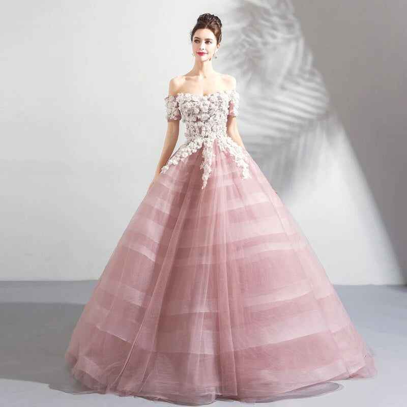 Suknia balowa z odkrytymi ramionami i krótkimi rękawami, koronkowa, z dekoltem w serek, na quinceanerę, z aplikacjami