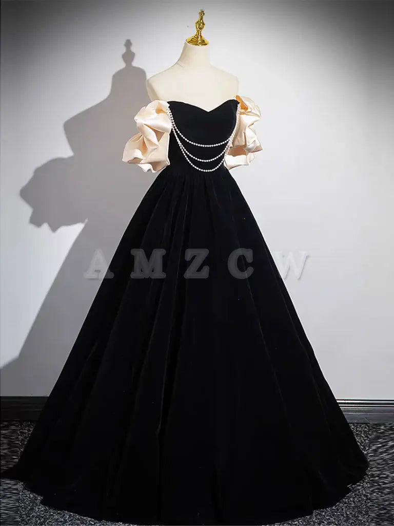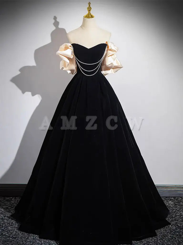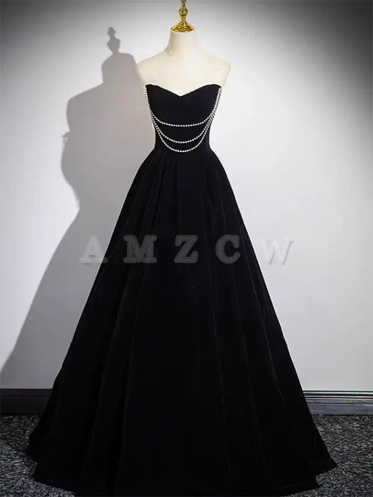Amzcw A-Line Black Velvet Long Prom Dress Black Long Evening Dress prom dress in store