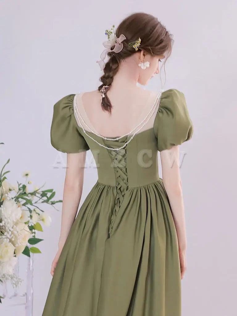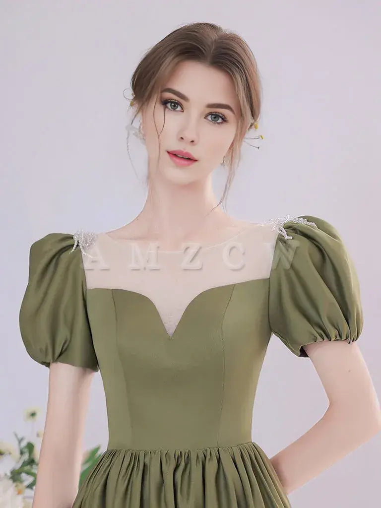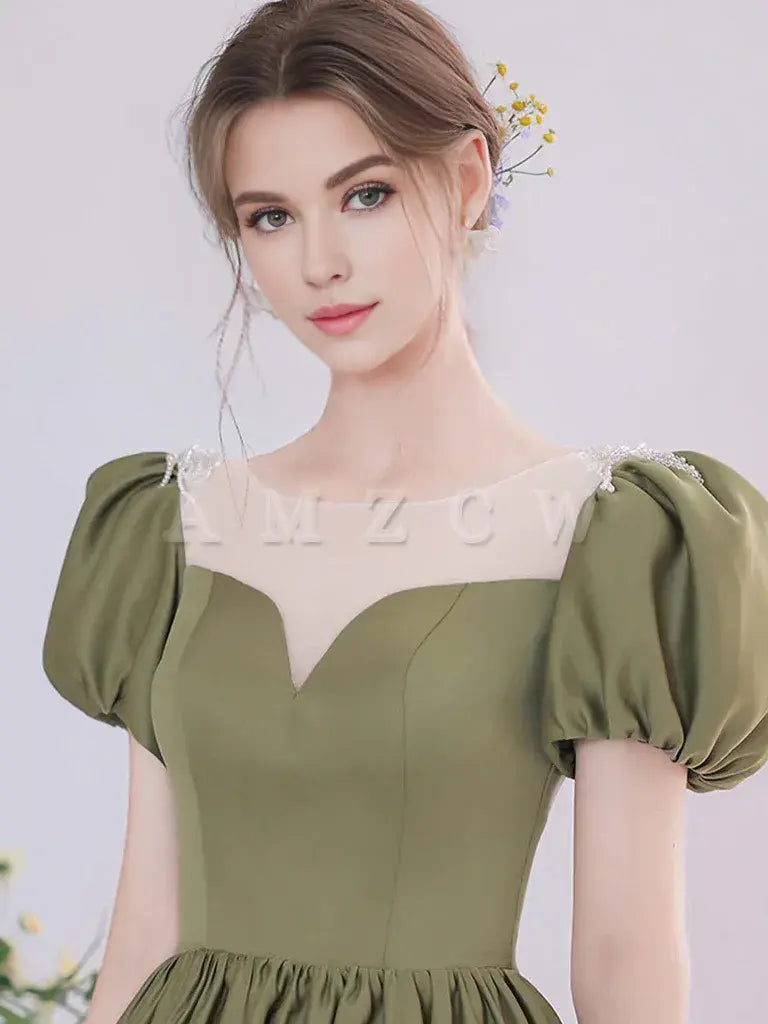 Amzcw A-Line Green Satin Tea Length Prom Dress Green Long Formal Dress prom dress in store