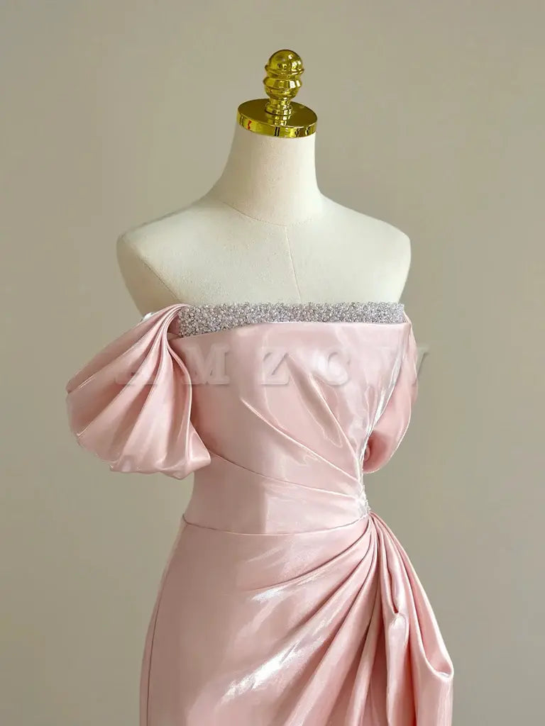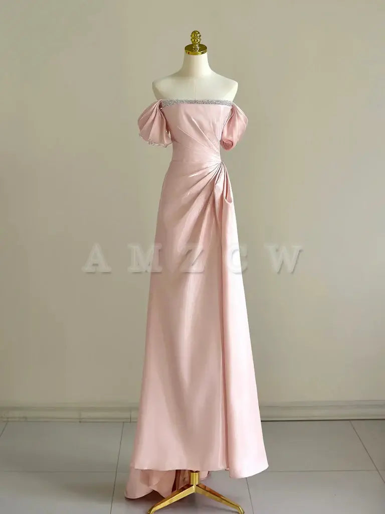 Amzcw A-Line Off Shoulder Pink Long Prom Dress Pink Long Formal Dress with Beads prom dress in store