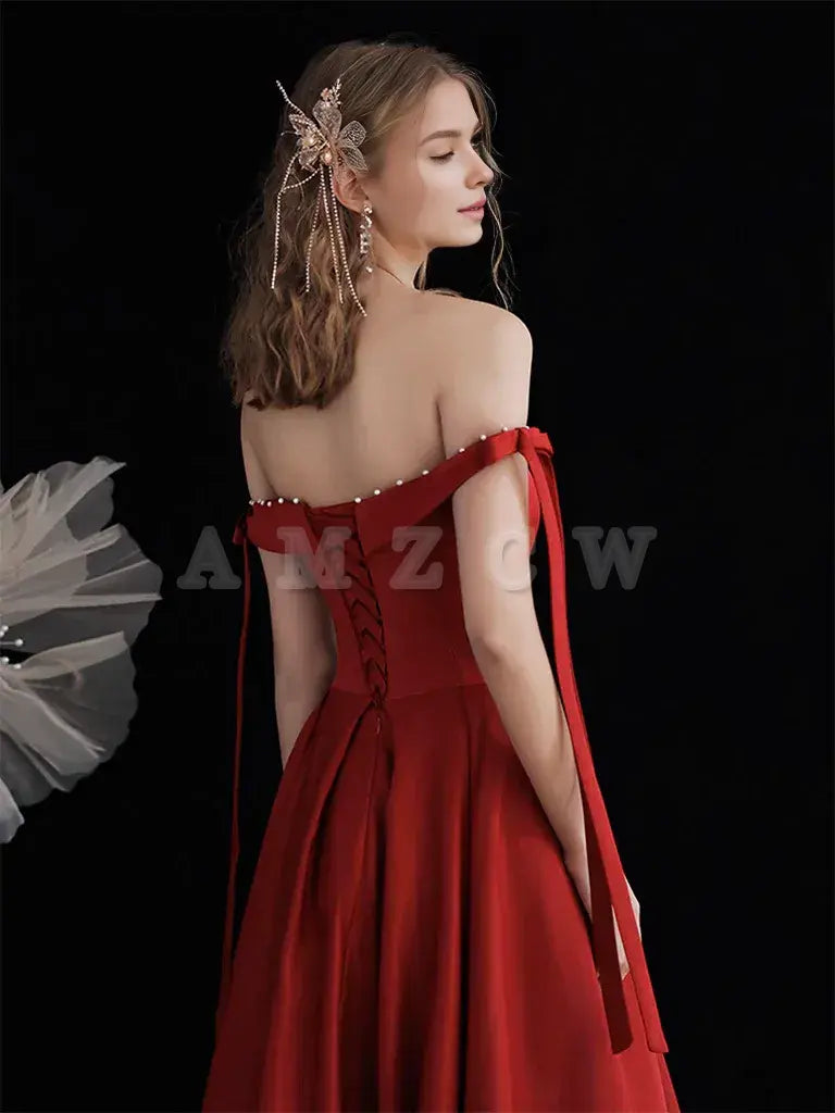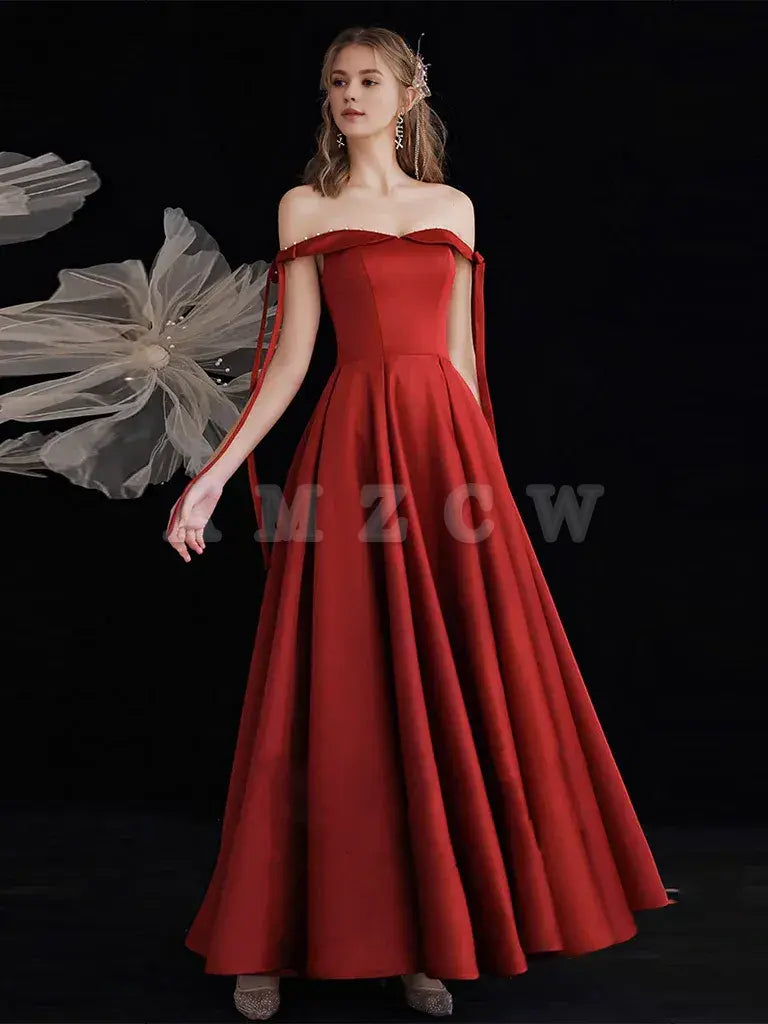 Amzcw A-Line Off Shoulder Satin Burgundy Long Prom Dress Burgundy Long Formal Dress prom dress in store