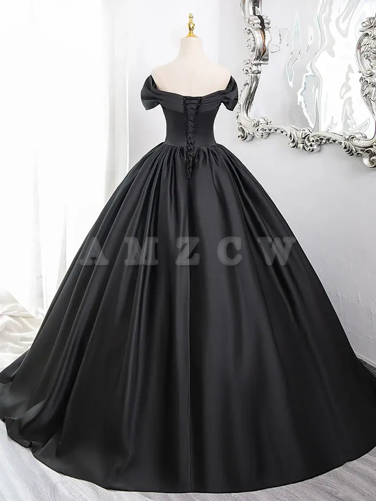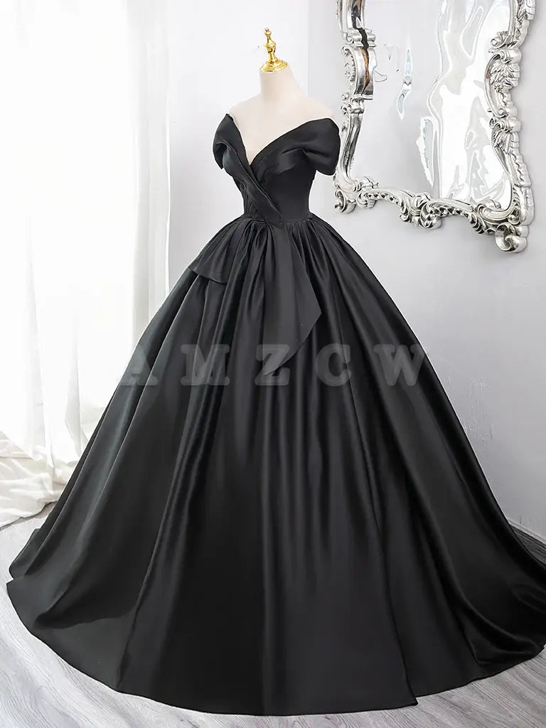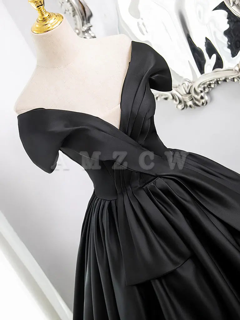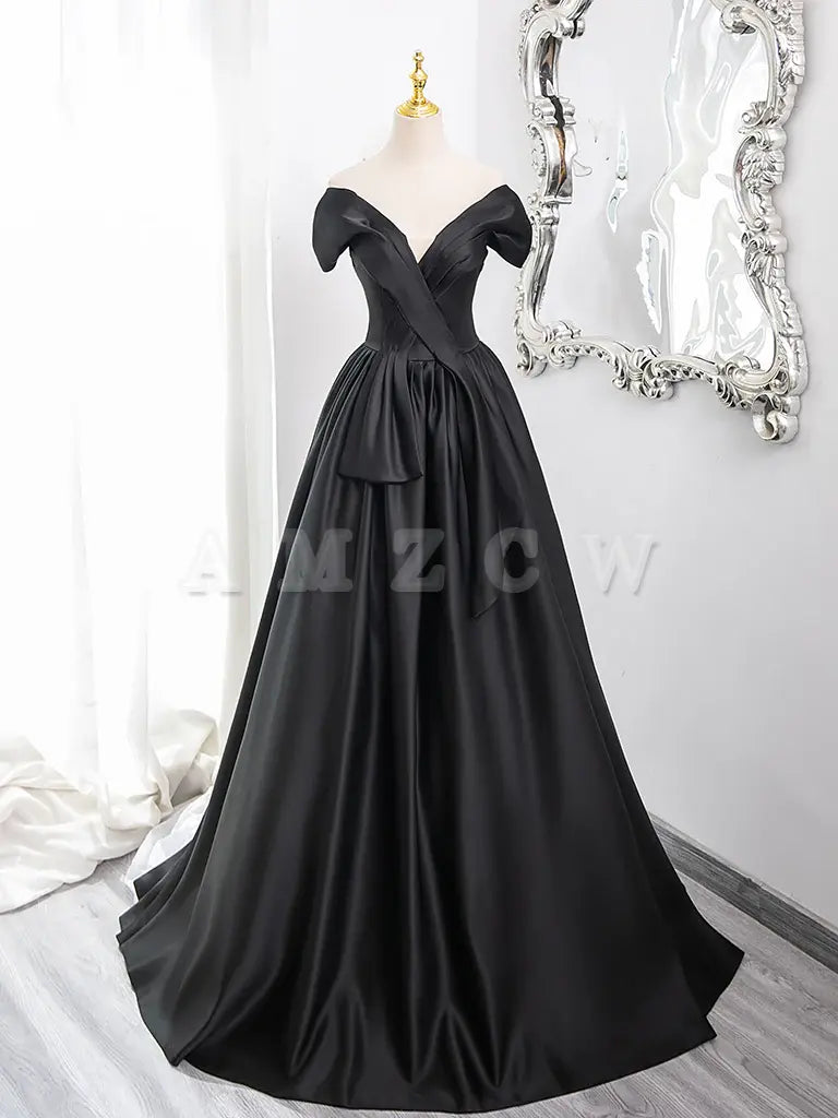 Amzcw A-Line V Neck Off Shoulder Satin Black Long Prom Dress Black Long Formal Dress prom dress in store