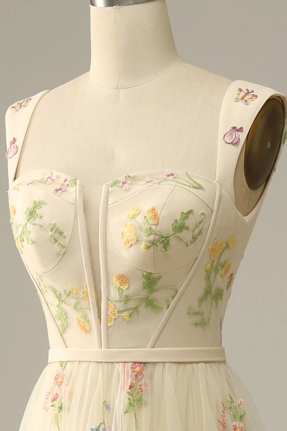 Amzcw Champagne A-Line Square Neck Embroidered Prom Dress