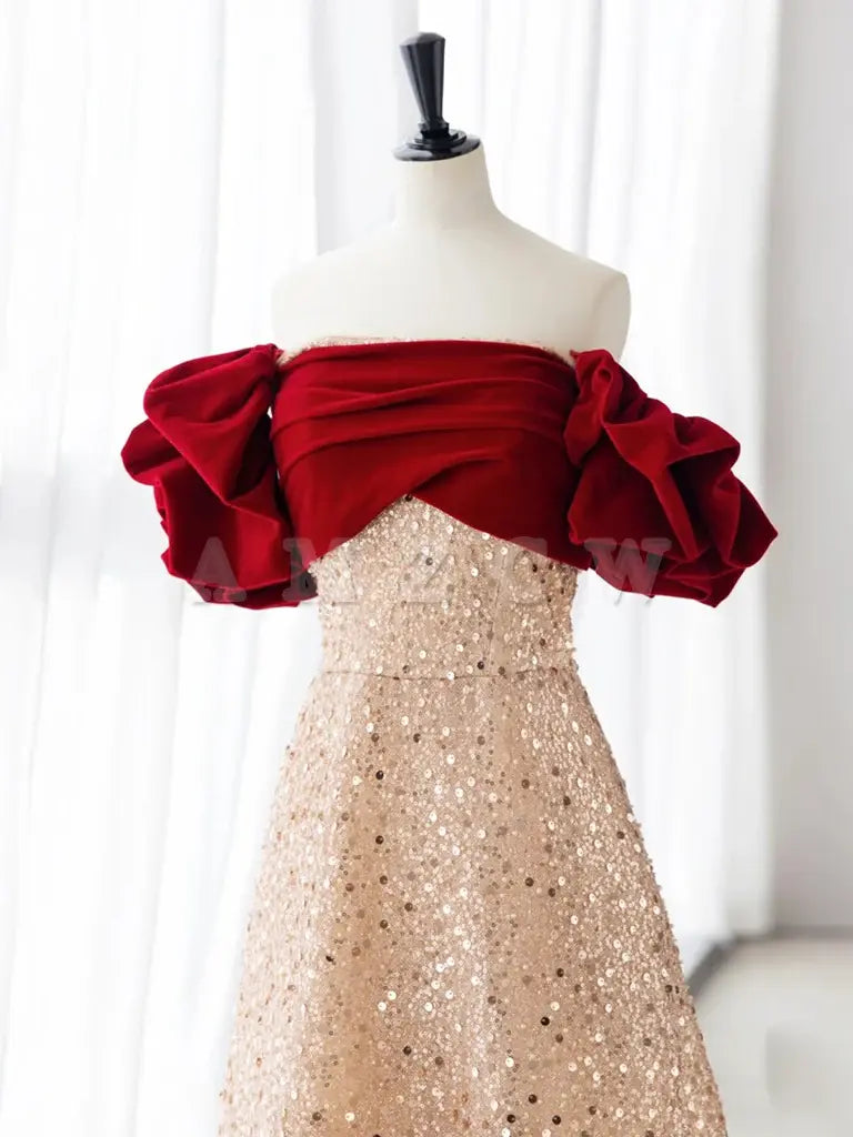 Amzcw Champagne A-Line velvet Long Prom Dress Champagne Tulle Sequin Long Formal Dress prom dress in store