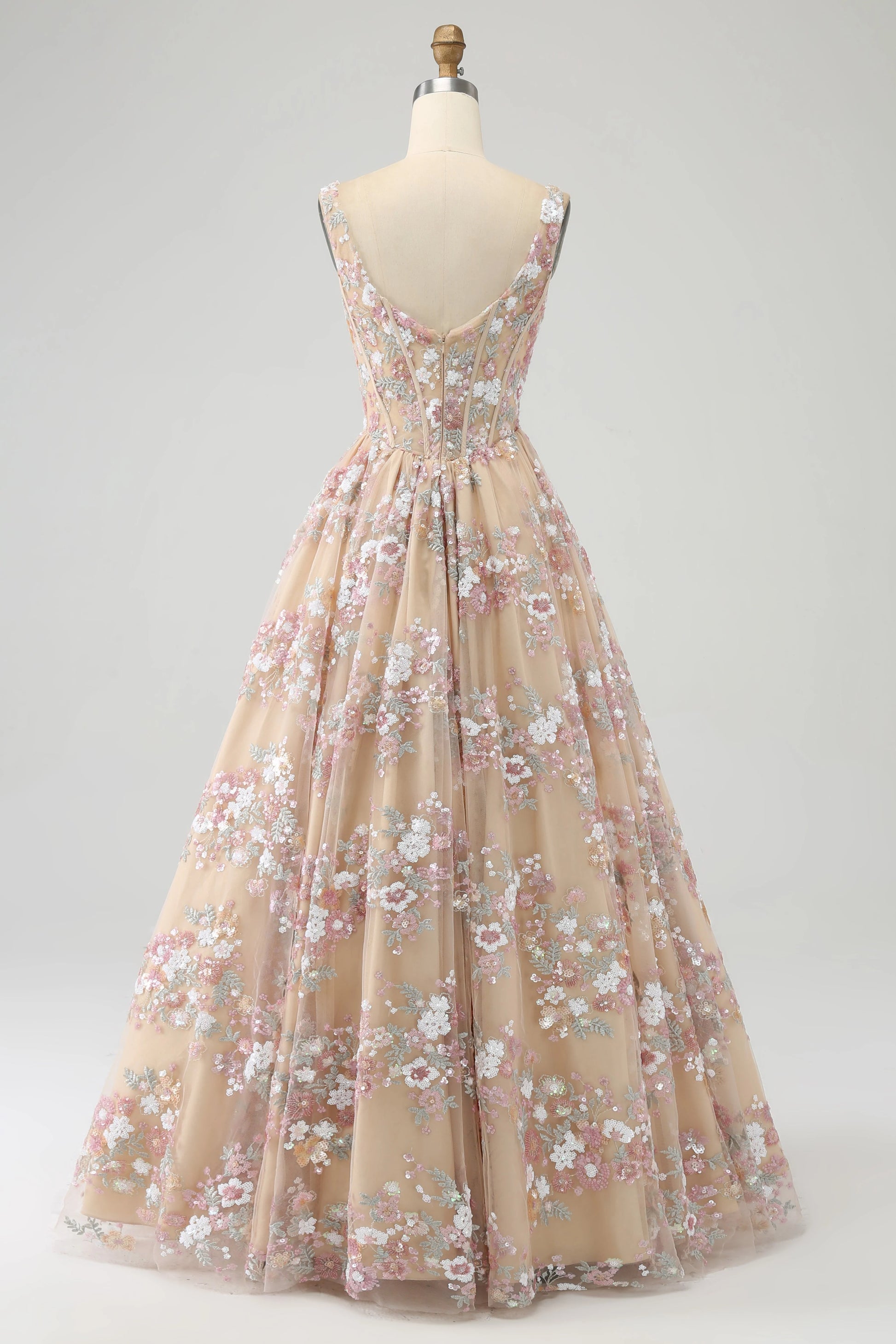 Amzcw Champagne Princess A-Line Square Neck Corset Long Prom Dress with Embroidery