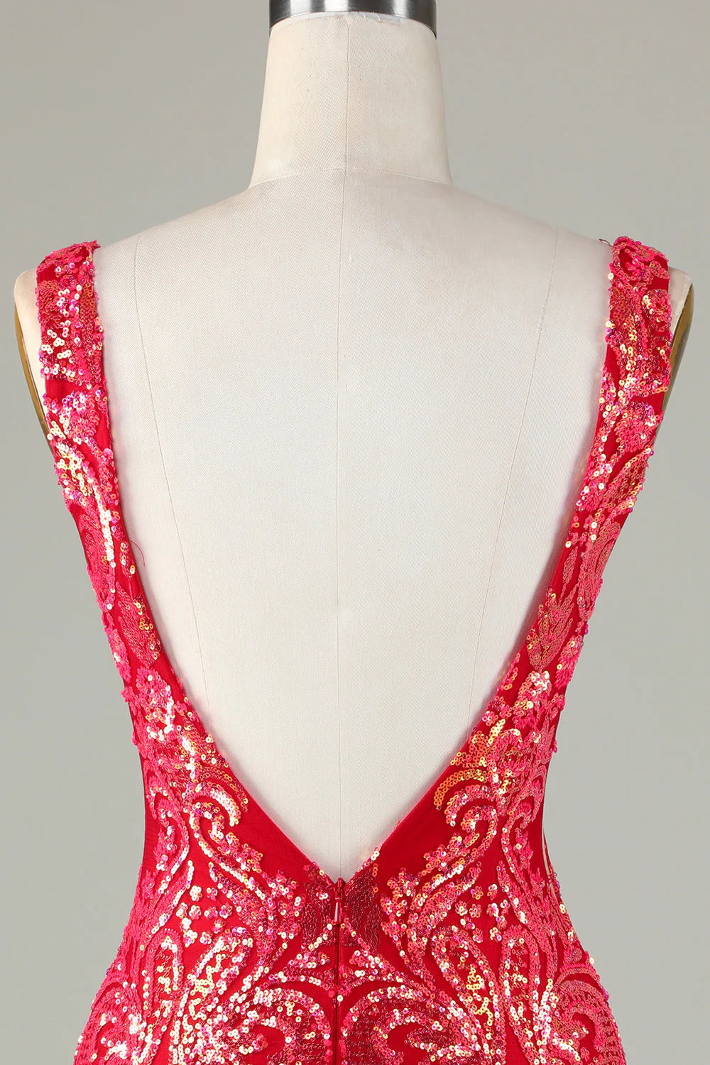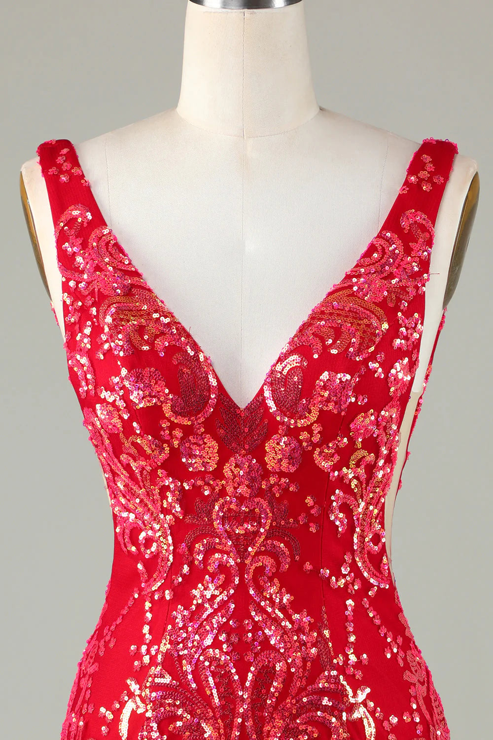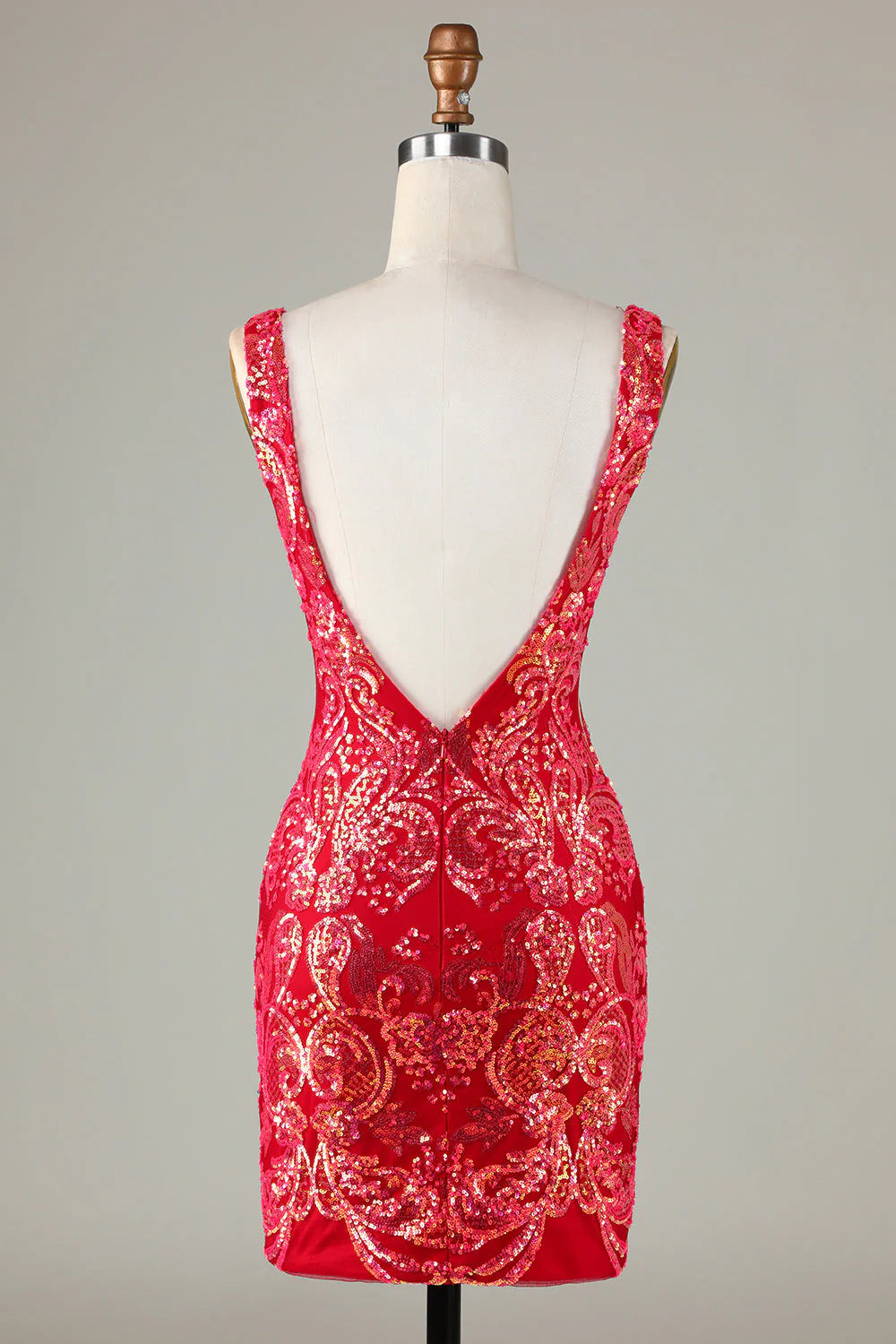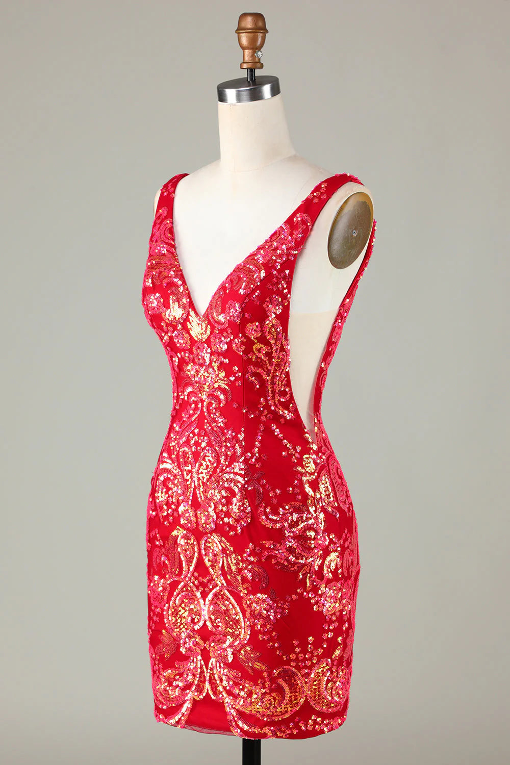 Amzcw Classy Red V Neck Backless Sparkly Sequin Tight Homecoming Dress