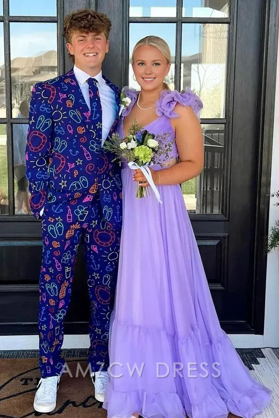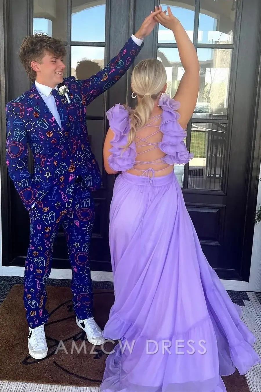 Amzcw Elegant Chiffon Lace-Up Ruffle Belted A-Line Prom Dress
