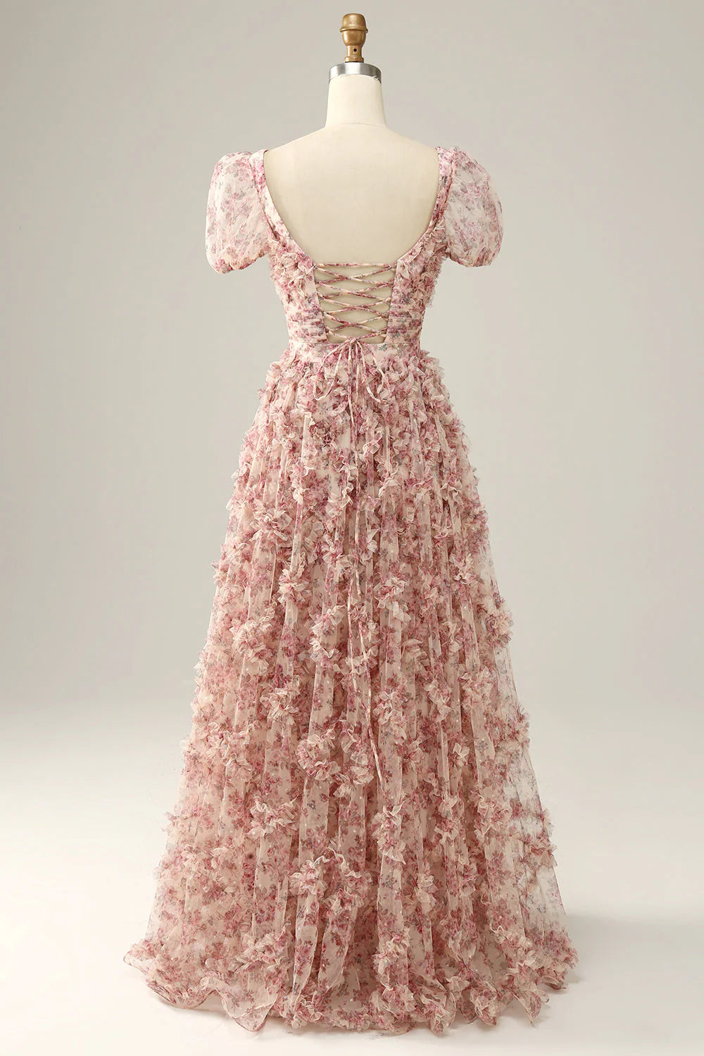 Amzcw Ivory Red Flower A Line Square Neck Tulle Long Prom Dress