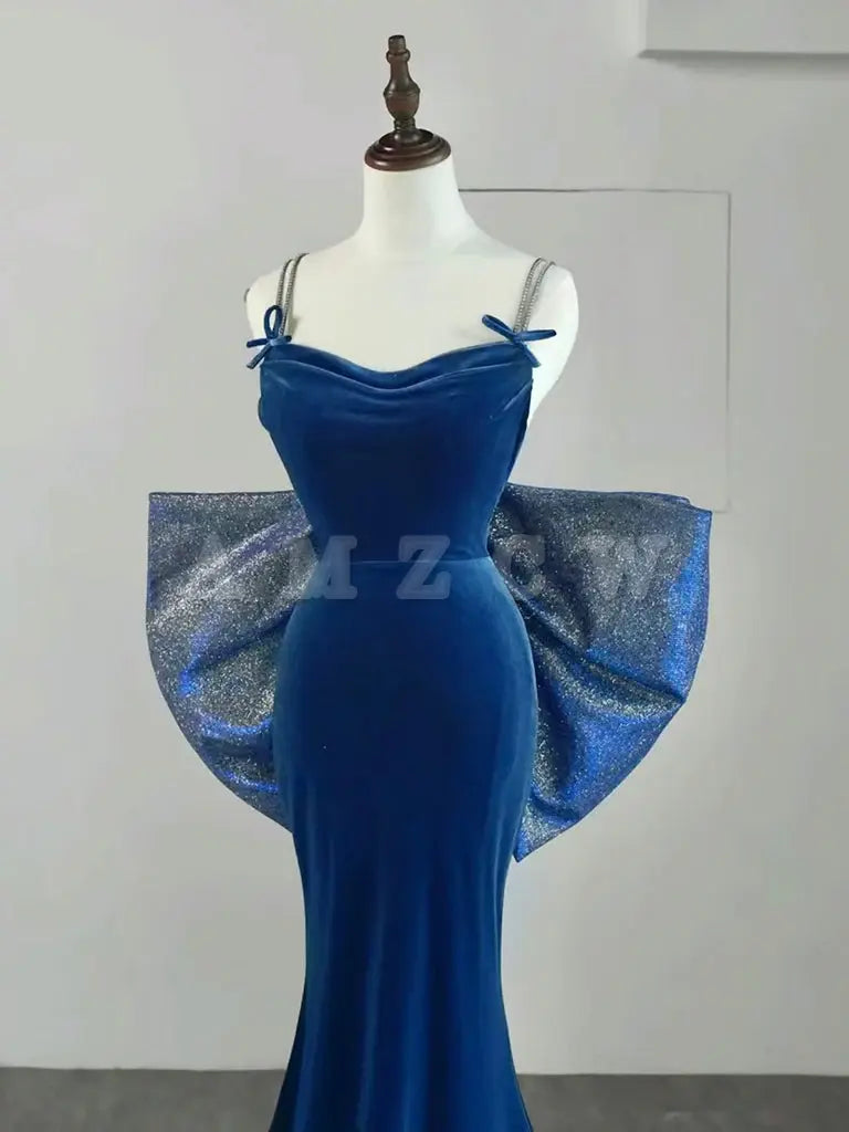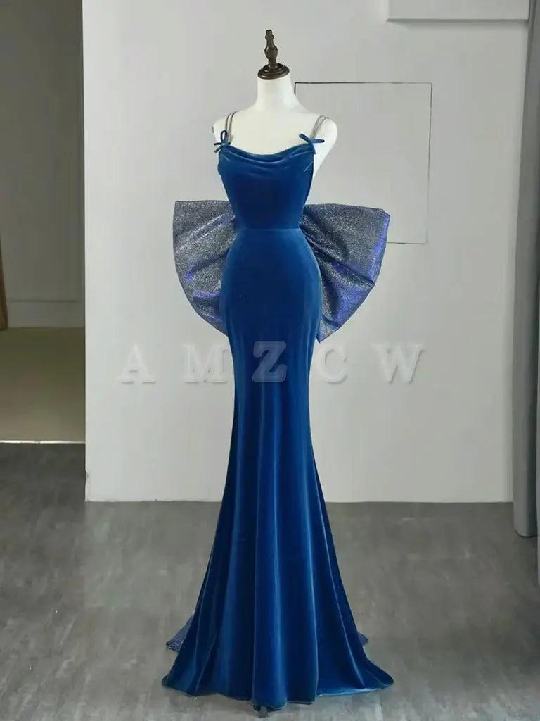 Amzcw Mermaid Velvet Blue Long Prom Dress Blue Long Evening Dress prom dress in store