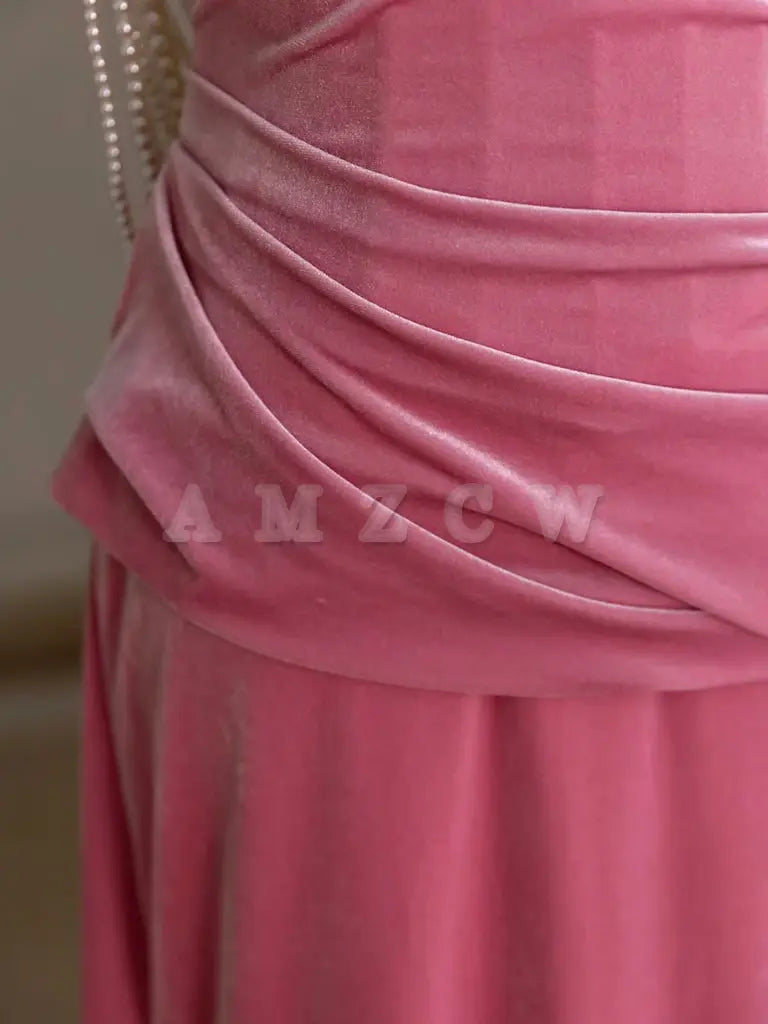 Amzcw Pink Mermaid Velvet Beads Long Prom Dress Pink Long Formal Dress prom dress in store