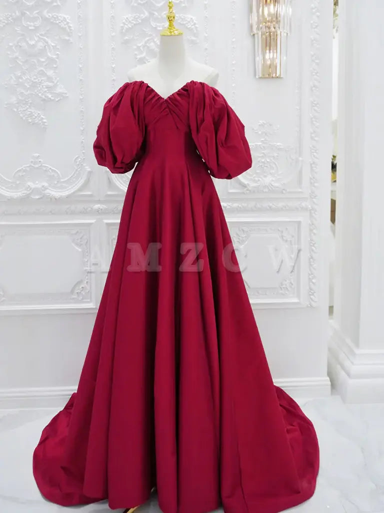 Amzcw Red V Neck Satin Long Prom Dress Red Puff Sleeves Satin Long Formal Dress prom dresses shops