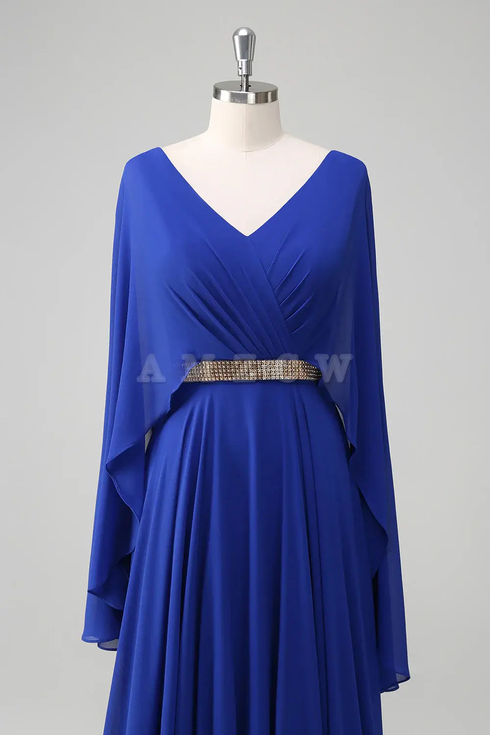 Amzcw Royal Blue A Line V-neck Chiffon Long Mother Dress with Belt gowns evening dresses
