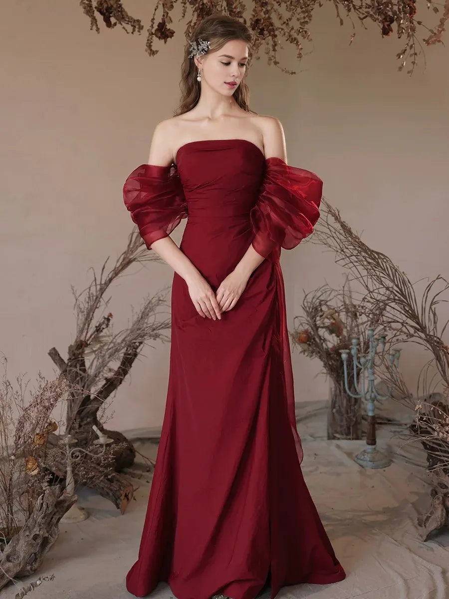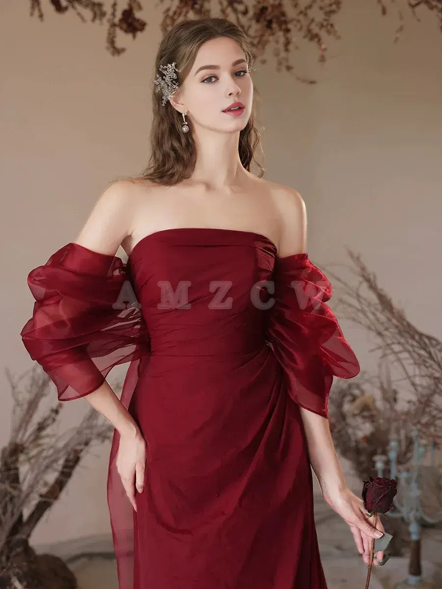 Amzcw Simple Off Shoulder Satin Burgundy Long Prom Dress Burgundy Evening Dress prom dress in store