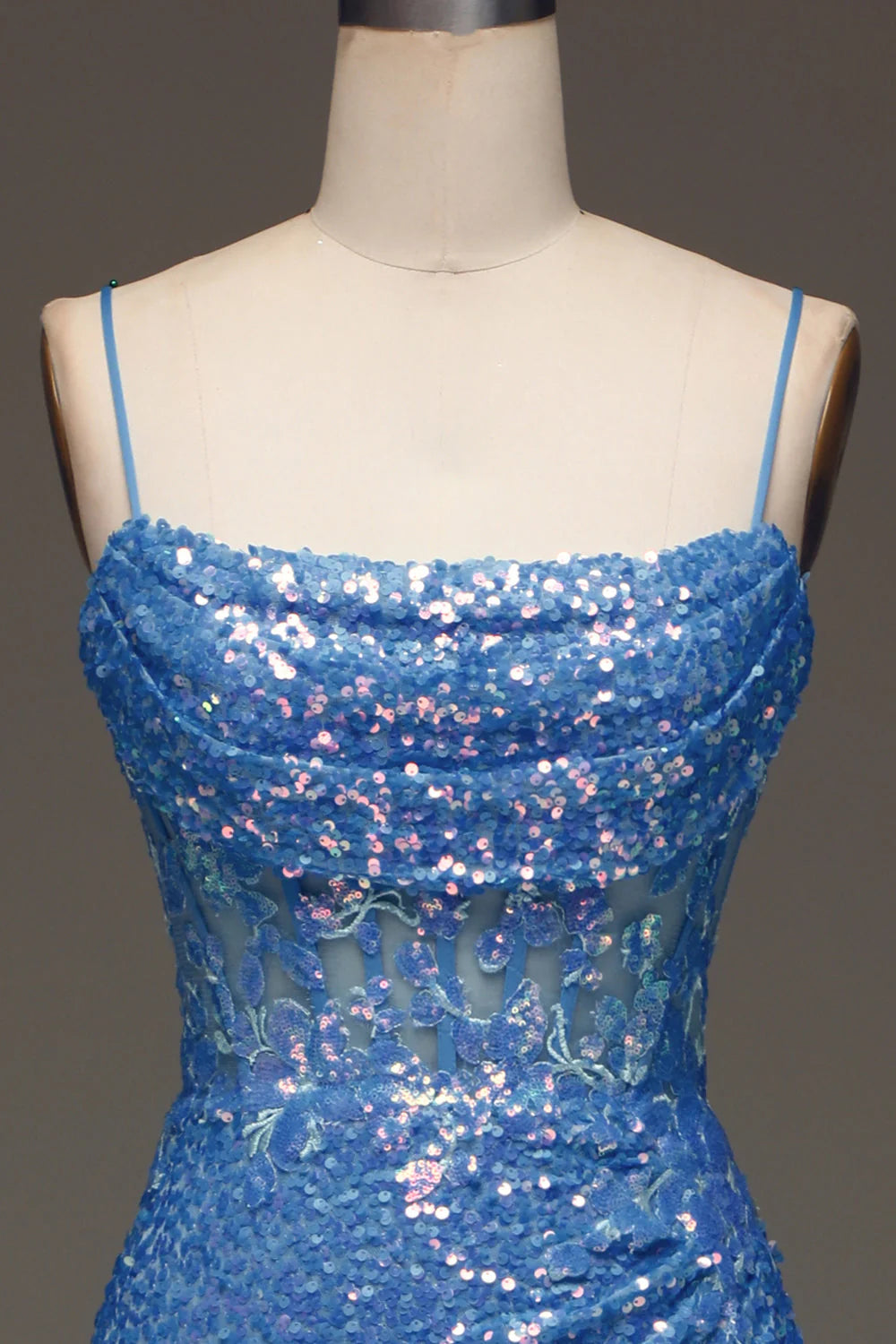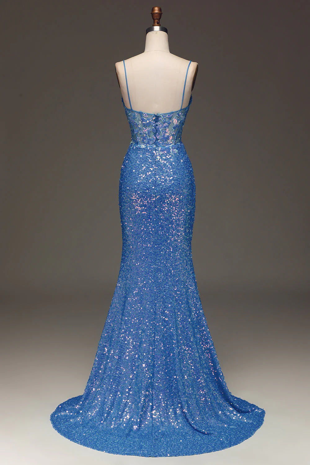 Amzcw Sparkly Blue Spaghetti Straps Corset Prom Dress with Slit