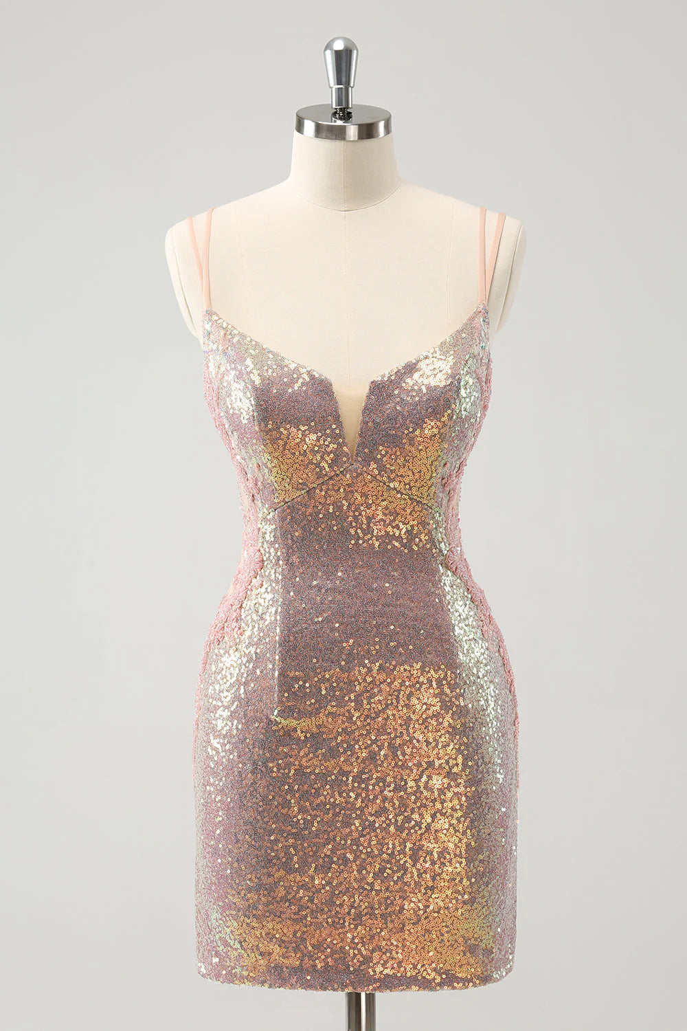 Amzcw Sparkly Blush Spaghetti Straps Tight Short Homecoming Dress with Lace-Up Back