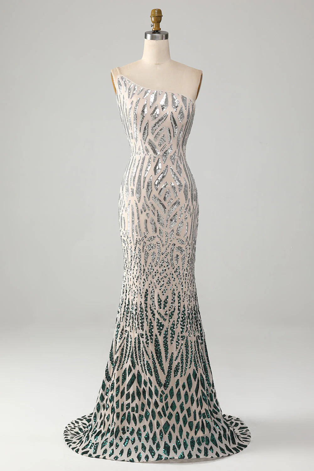 Amzcw Sparkly Dark Green Mermaid One Shoulder Sequins Long Prom Dress prom dresses with long sleeves