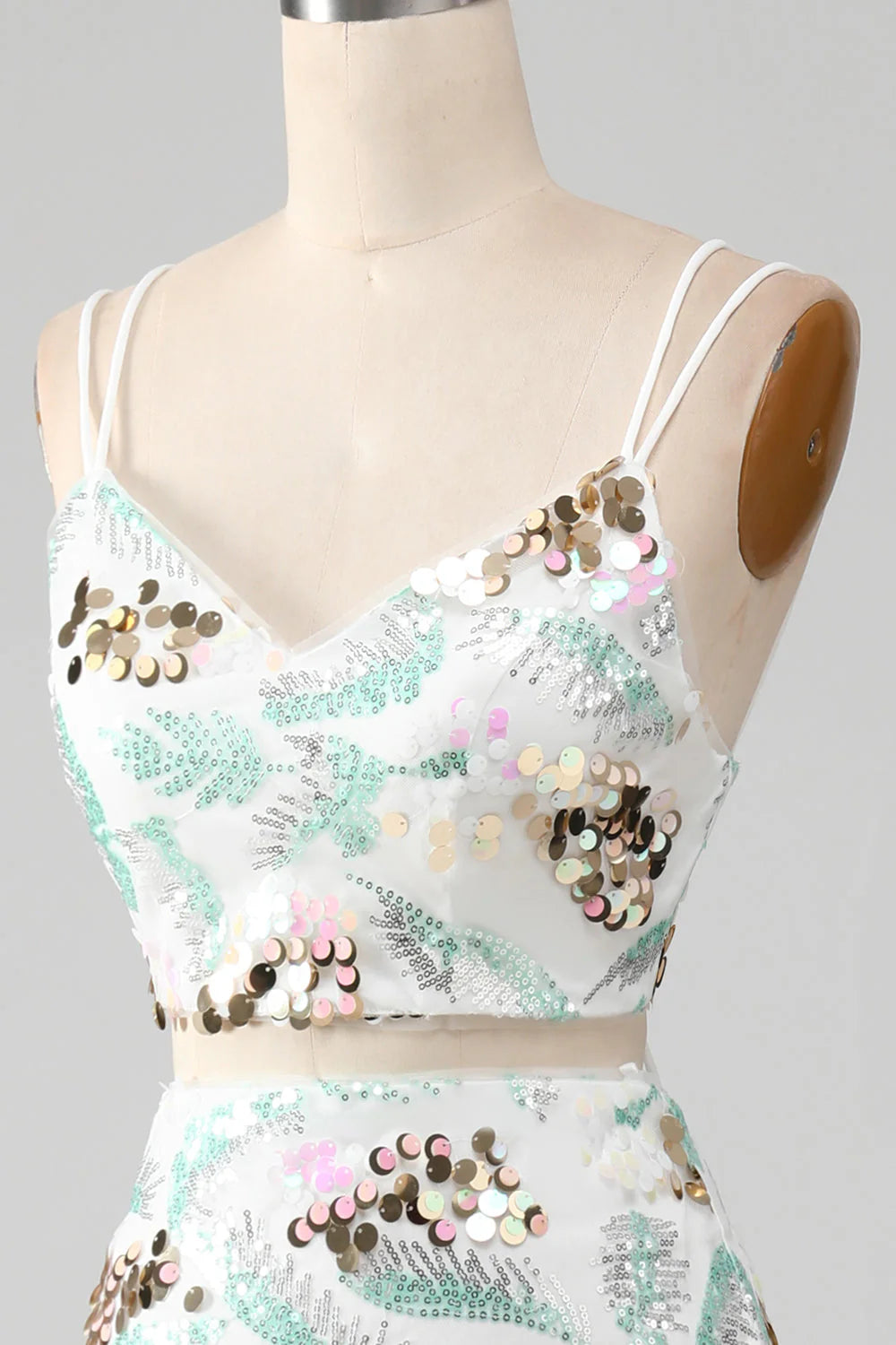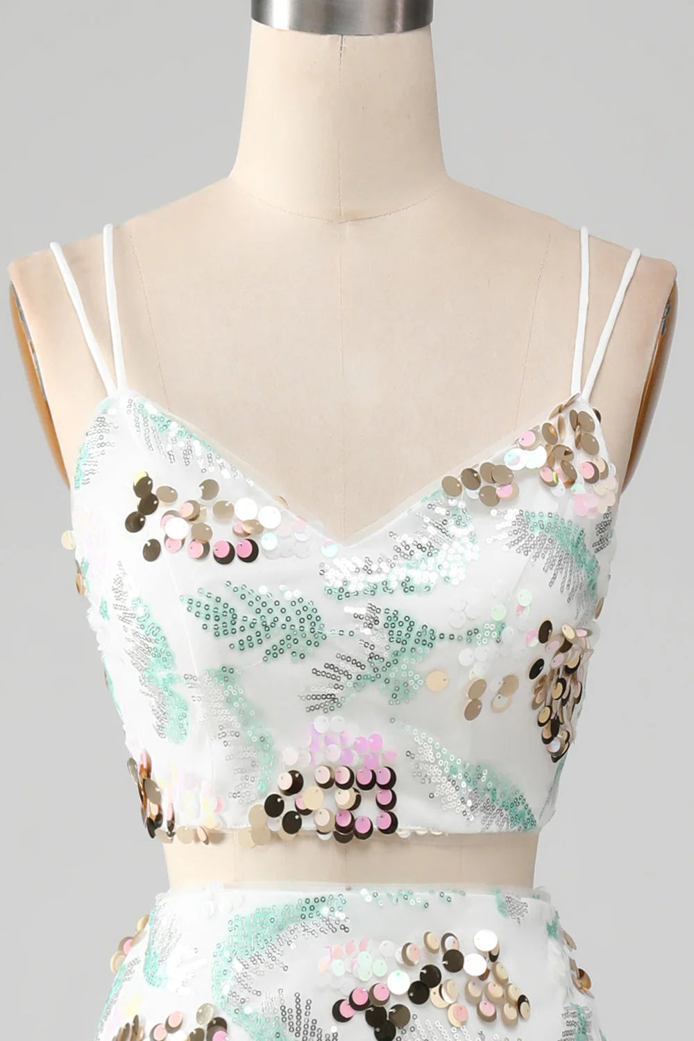 Amzcw White Mermaid Two-Piece Sparkly Sequin Prom Dress with Slit prom clothing