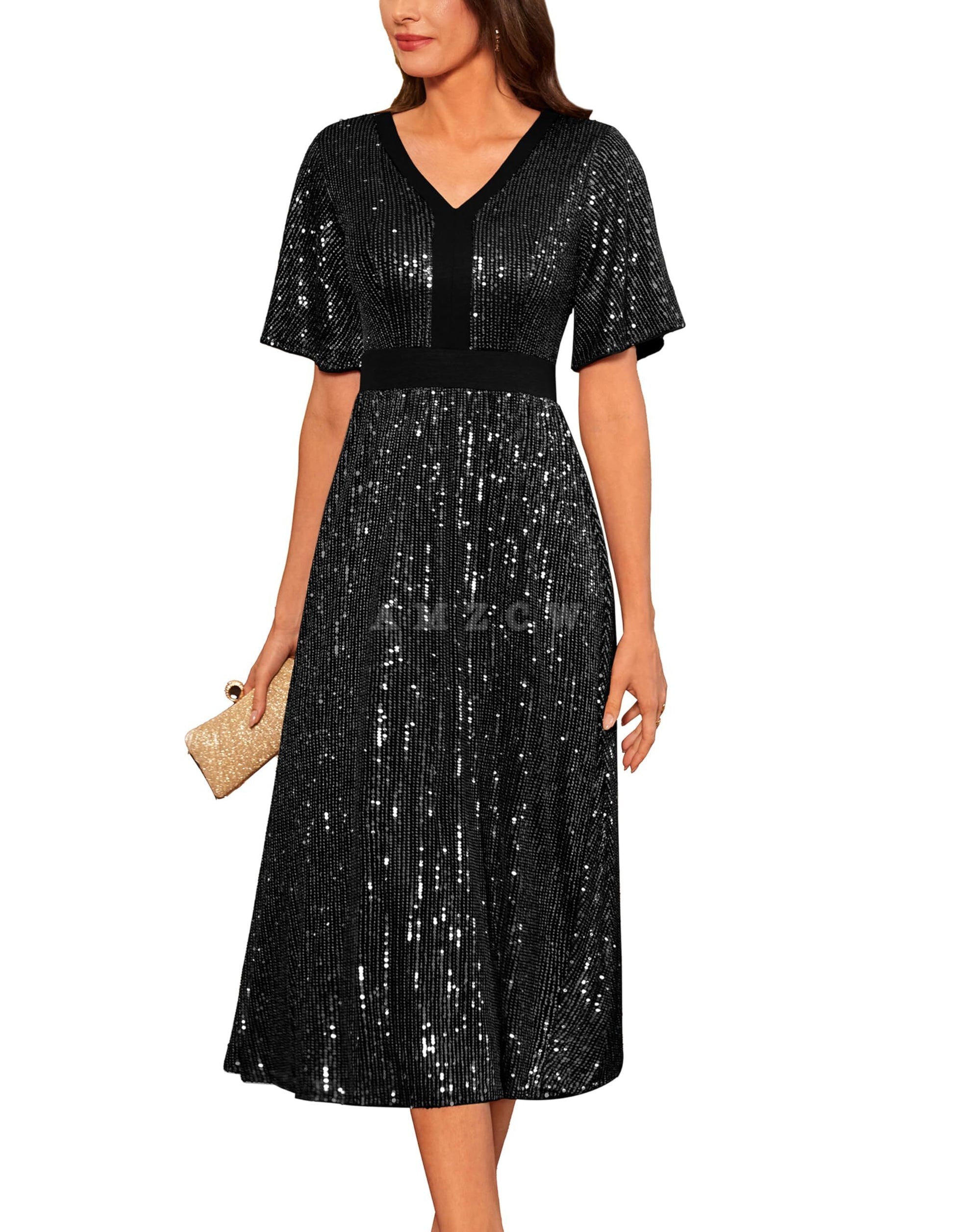 Amzcw Women's Sequin V Neck Ruffle Sleeve Empire Waist Sparkly Glitter A Line Cocktail Formal Dresses dresses evening wear