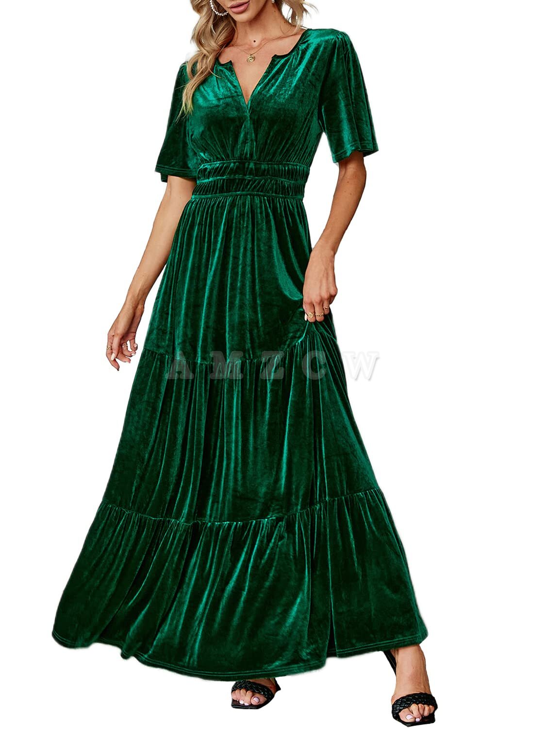 Amzcw Women's Velvet Short Sleeve V Neck Formal Wedding Guest Maxi Dresses Fall Evening Party Long Dresses dresses evening wear