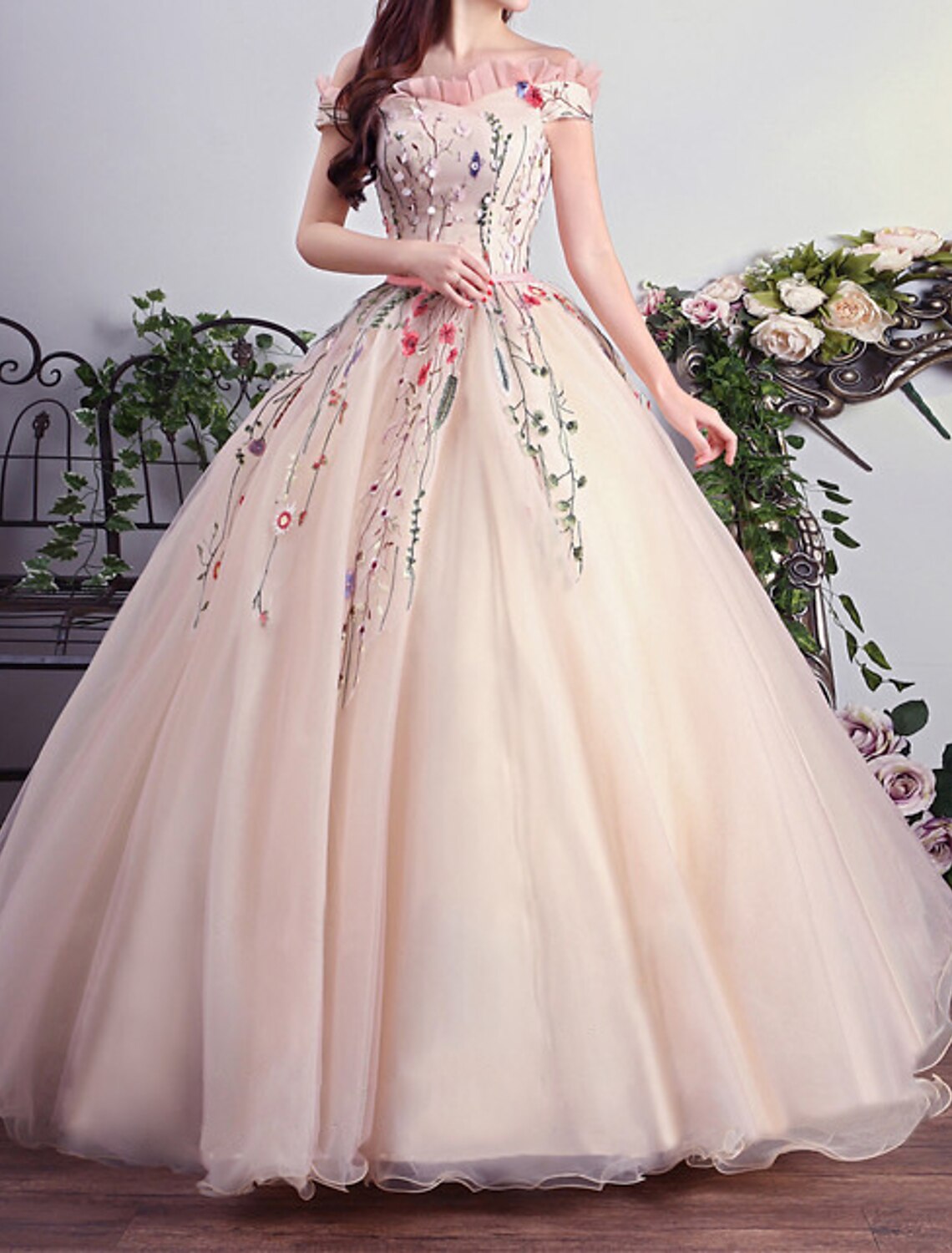 Ball Gown Prom Dresses Luxurious Dress Quinceanera Prom Floor Length Short Sleeve Off Shoulder Tulle with Pleats Embroidery