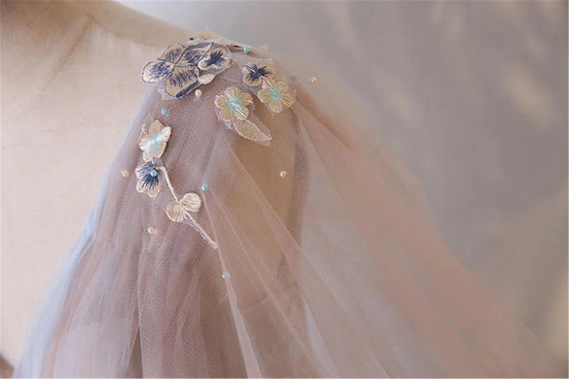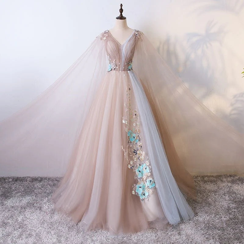 Ball Gown V Neck Tulle Prom Dress With Appliques, Unique Floor Length Quinceanera Dresses