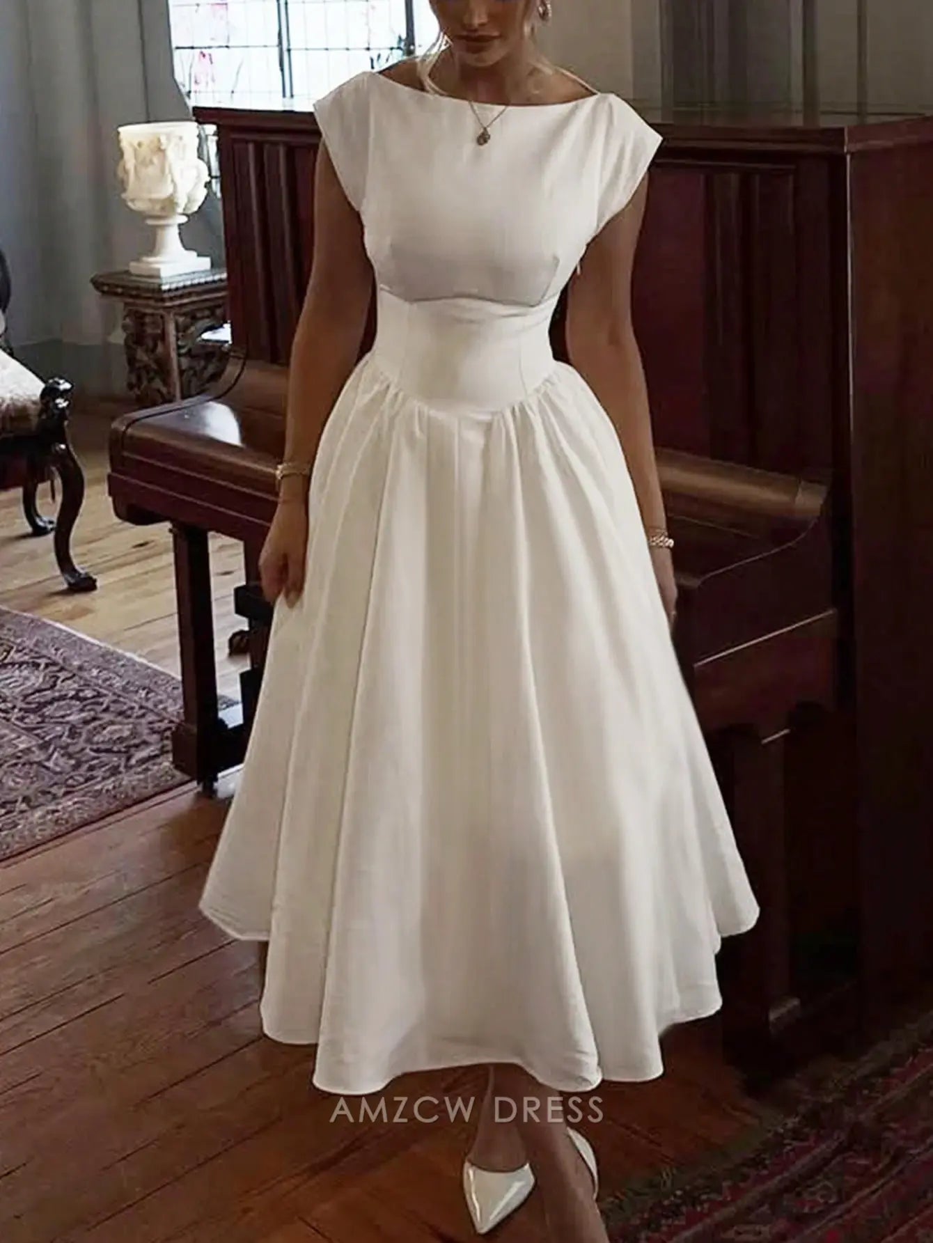 Step into timeless retro charm with Amzcw's crew neck keyhole back fit-and-flare satin midi dress. The structured crew neck and tailored bodice (paired with a voluminous, flowy flared skirt) highlight your silhouette elegantly, while the keyhole cutout back adds a subtle alluring detail. The crisp white hue creates a stunning, versatile fit—ideal for bridal events, semi-formal dinners, or daytime galas. The smooth satin fabric and iconic fit-and-flare silhouette further elevate its appeal, ensuring you exude grace and sophistication at any polished occasion.