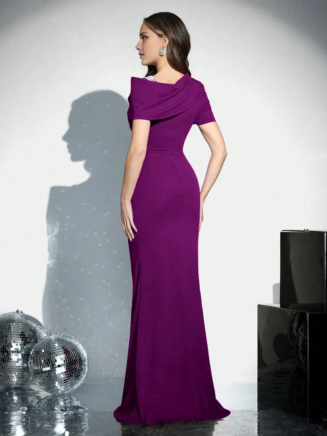 Elevate your formal look with Amzcw's sleek plum purple mermaid gown. Crafted from structured, figure-flattering fabric, it features a dramatic one-shoulder off-the-shoulder neckline (adorned with delicate beading), tailored short sleeves, and strategic ruching that accentuates your waist. The fitted mermaid silhouette flows into a floor-length hem, perfect for evening dinners, gala celebrations, wedding guest events, or upscale formal gatherings. Its rich hue and polished details balance refinement and allure for a standout elegant appearance.