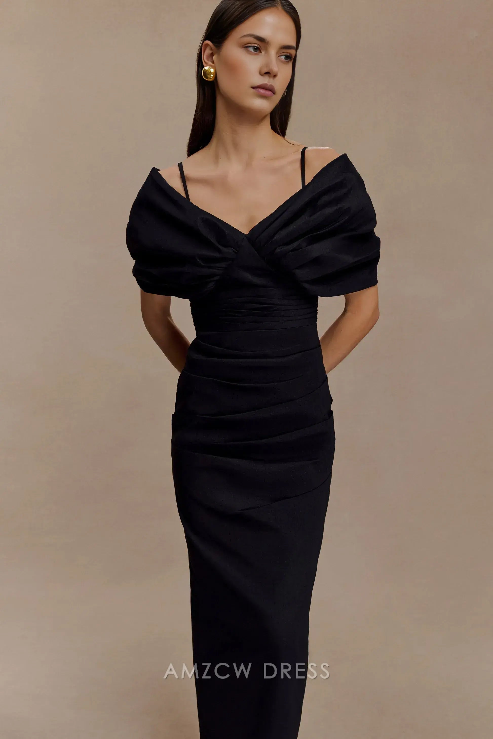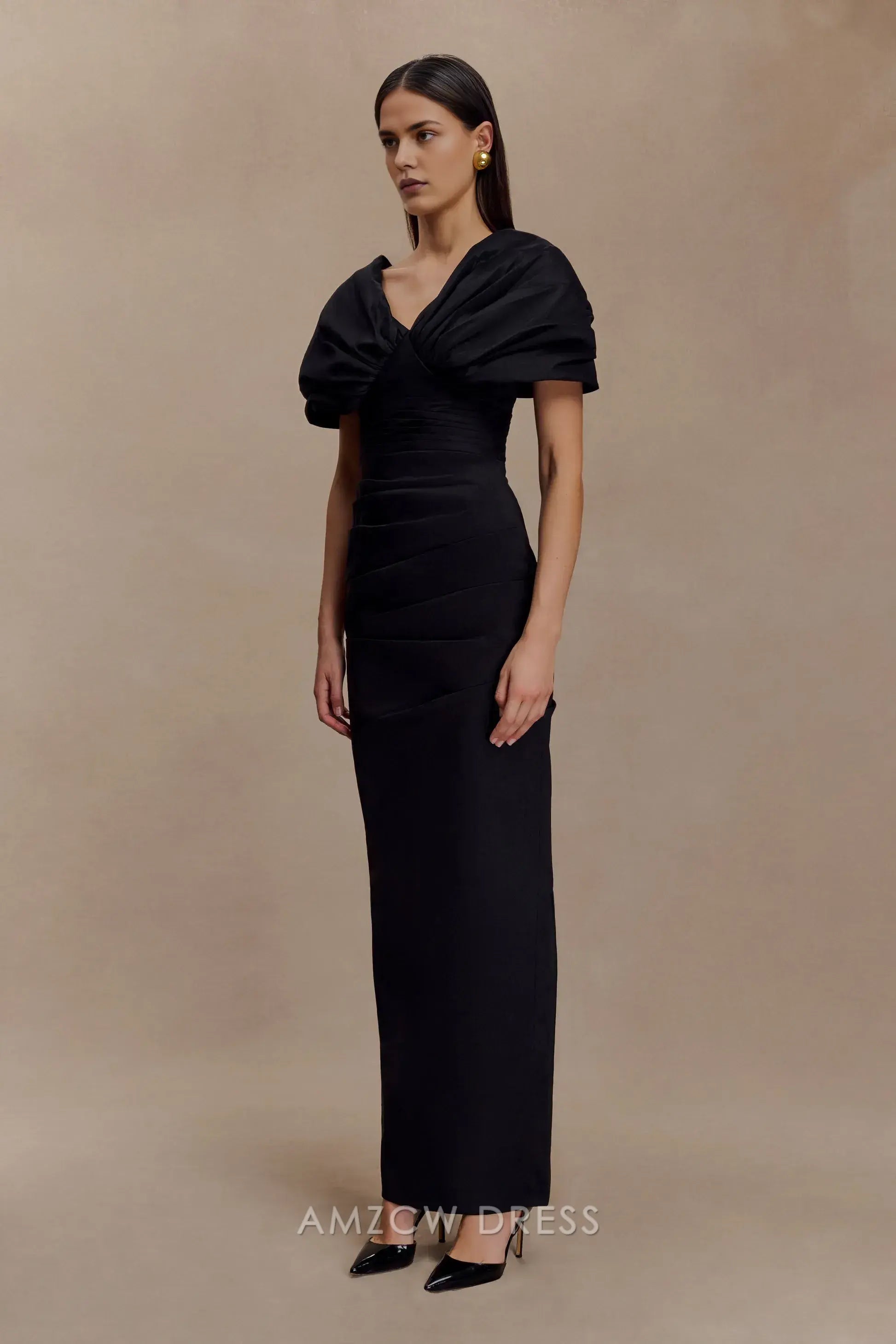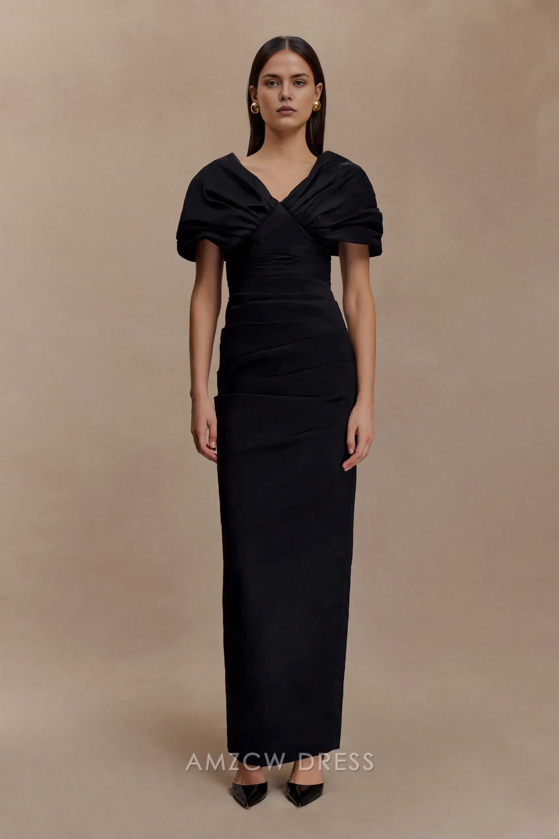 Elegant Sheath/Column V - Neck Puff Sleeve Maxi Dress with Back Slit Prom Dress