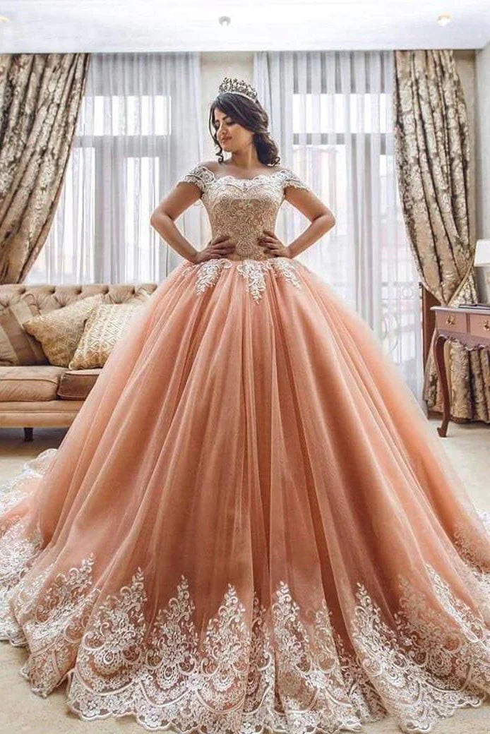 Off the Shoulder Ball Gowns Prom Dresses Lace Appliques Tulle Pink Quinceanera Dresses